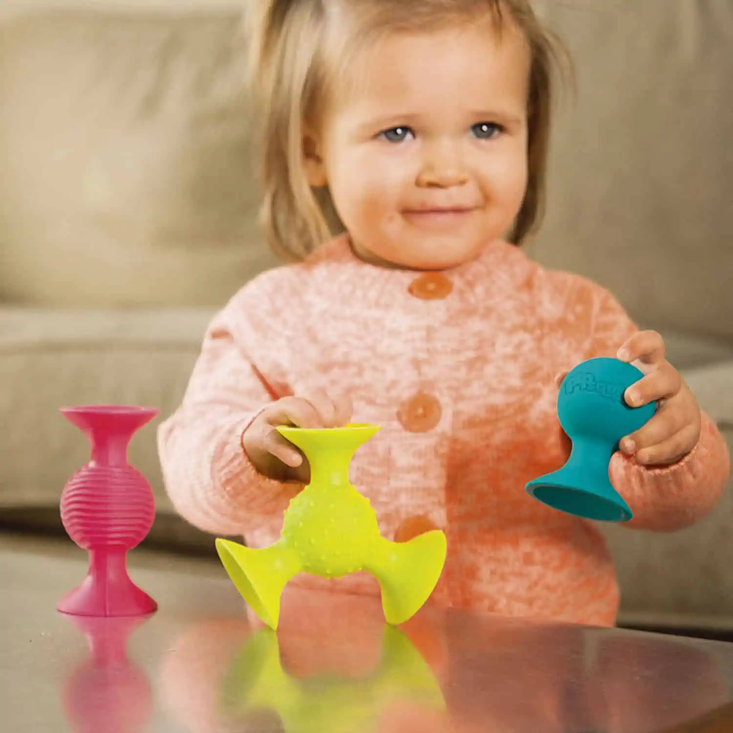 Die beliebten Squigz gibt es jetzt auch als Spielzeug für die Sinneswahrnehmung. Jedes der drei Teile hat eine spezielle Textur und erzeugt Rasselgeräusche.