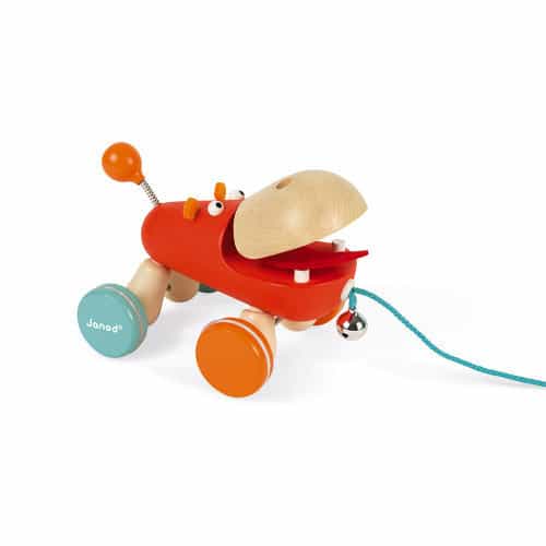 Dieses verrückte Nilpferd hilft beim Laufen lernen und erfreut das Gehör des Kindes durch seine Glocke unter dem Kopf. Das Nilpferd streckt beim Laufen die Zunge raus und wackelt lustig, sodass die Glocke klingelt. Das Tier besteht aus qualitativ hochwertigem Holz und ist mit Wasserfarben lackiert.