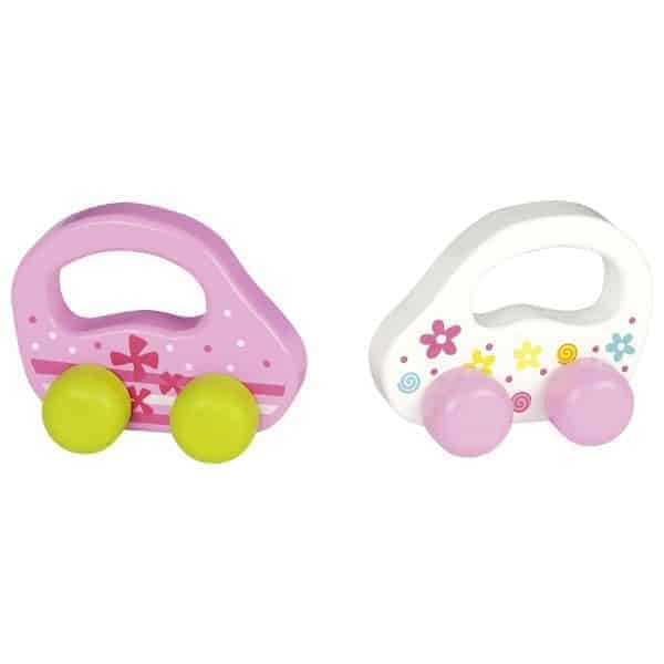 Zwei Schiebefahrzeuge in weiß und rosa, bunt bemalt mit hübschen Details.