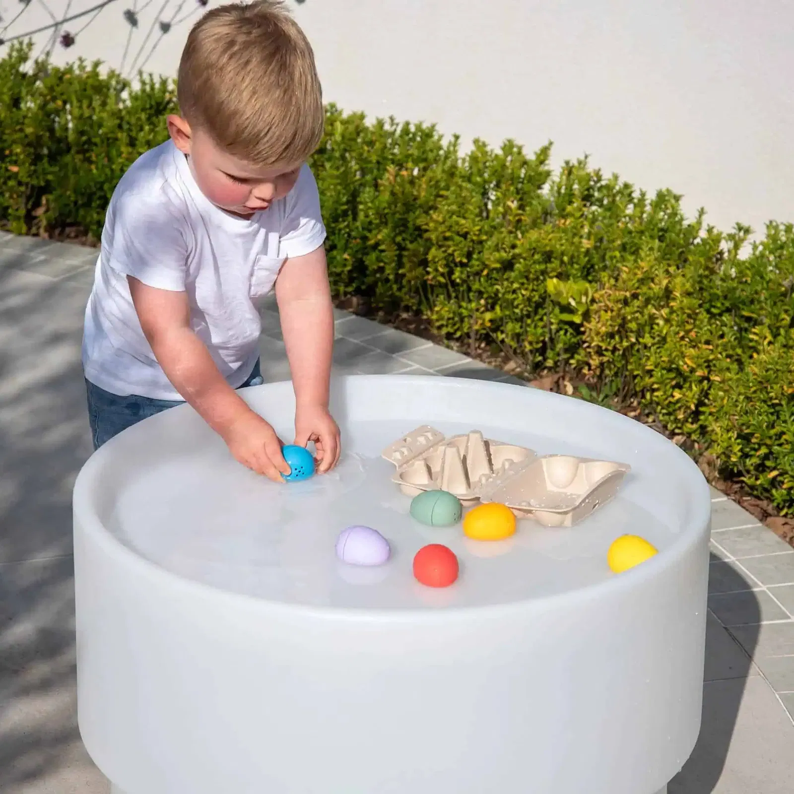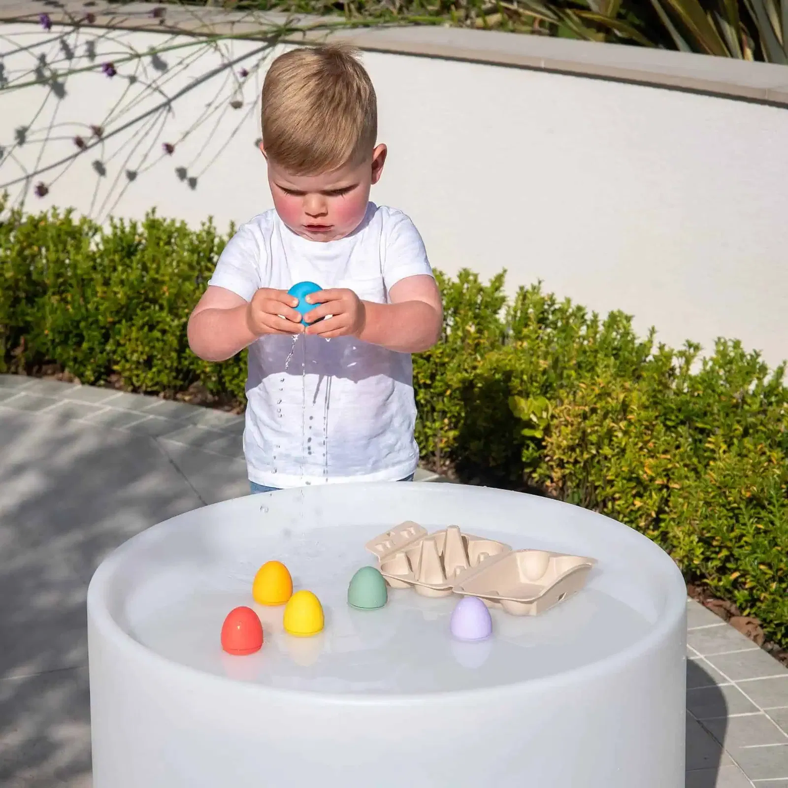 Das Set enthält 6 lebensmittelechte Silikon‑Eier mit 1–6 verschiedenen Löchern zum Befüllen für sensorische Rasseln, Duft‑Experimente oder Wasserspaß. In praktischer Box – ab 12 M.