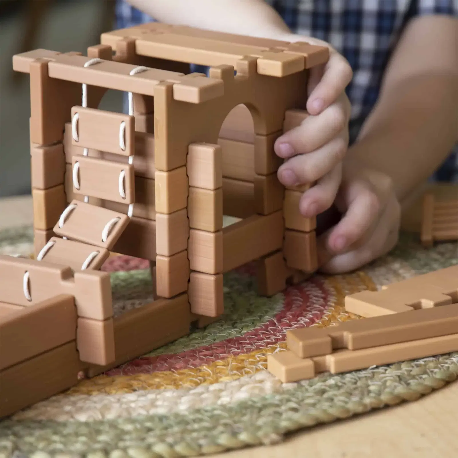 Die Tabletop Notch Blocks – Western bringen authentisch inspirierte Architektur-Ideen auf den Tisch: Kinder ab 3 Jahren stecken stabile Bauwerke dank Kerben sicher zusammen, planen Plattformen und Übergänge mit Brücken & Leitern und ergänzen auf Wunsch Loose Parts aus der Natur. Das widerstandsfähige TPE macht das Set innen wie außen einsetzbar – sogar im Spiel mit Wasser, Sand oder Erde. Die 10 doppelseitigen Inspirationskarten liefern Bildimpulse zu westlicher Architektur und fördern Gespräche über Formen, Funktionen und Bauweisen. Erhältlich als 85- oder 129-teiliges Set für Zuhause, Kita und Klassenraum.