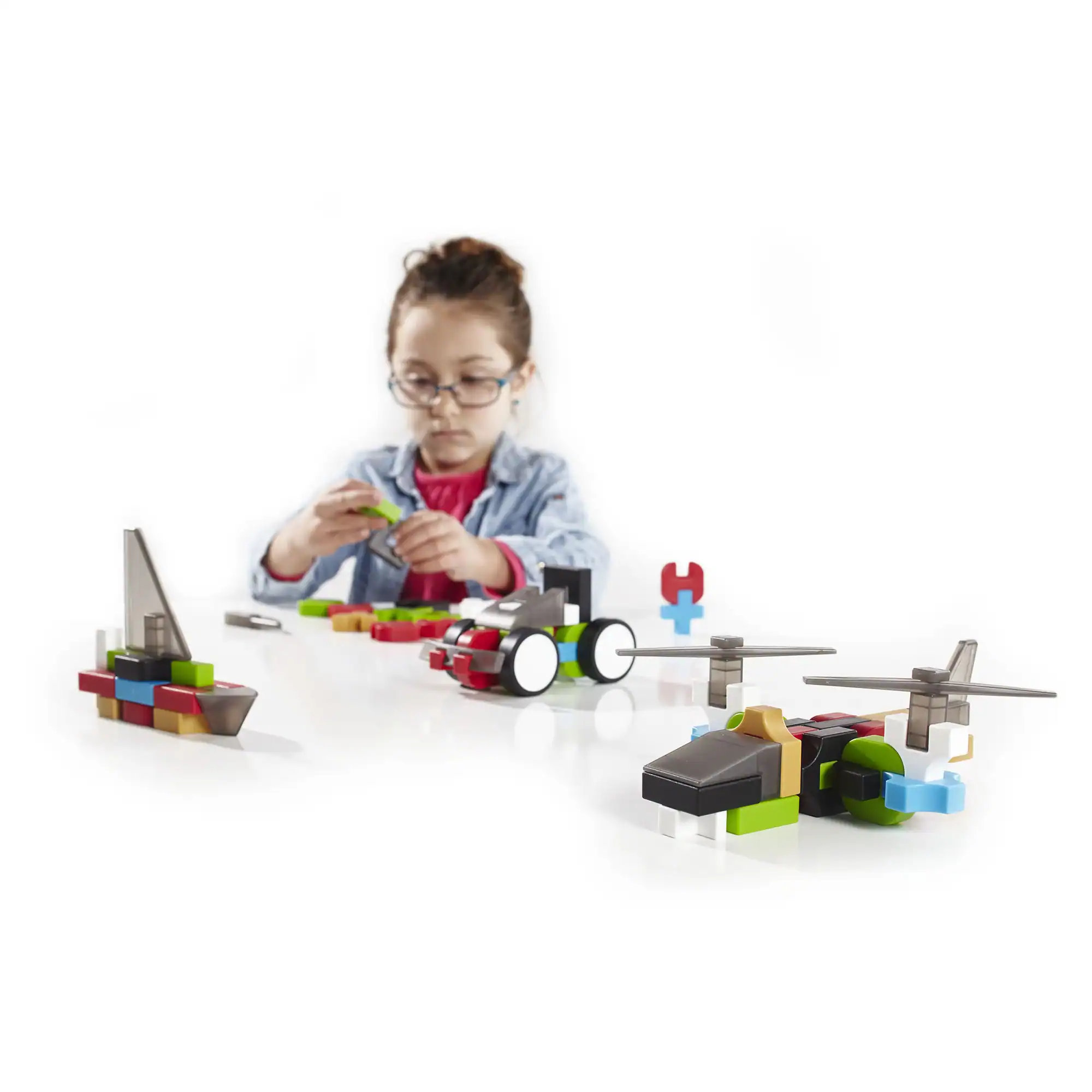 Fahrzeuge konstruieren mit AR-Support: 96 IO Blocks mit Friction-Fit und Soft-Touch – inkl. 2 IO Heroes & Tracker-Pad. Transparente Fahrzeug-Teile (Flügel, Kabinen, Räder). Ab 4+.