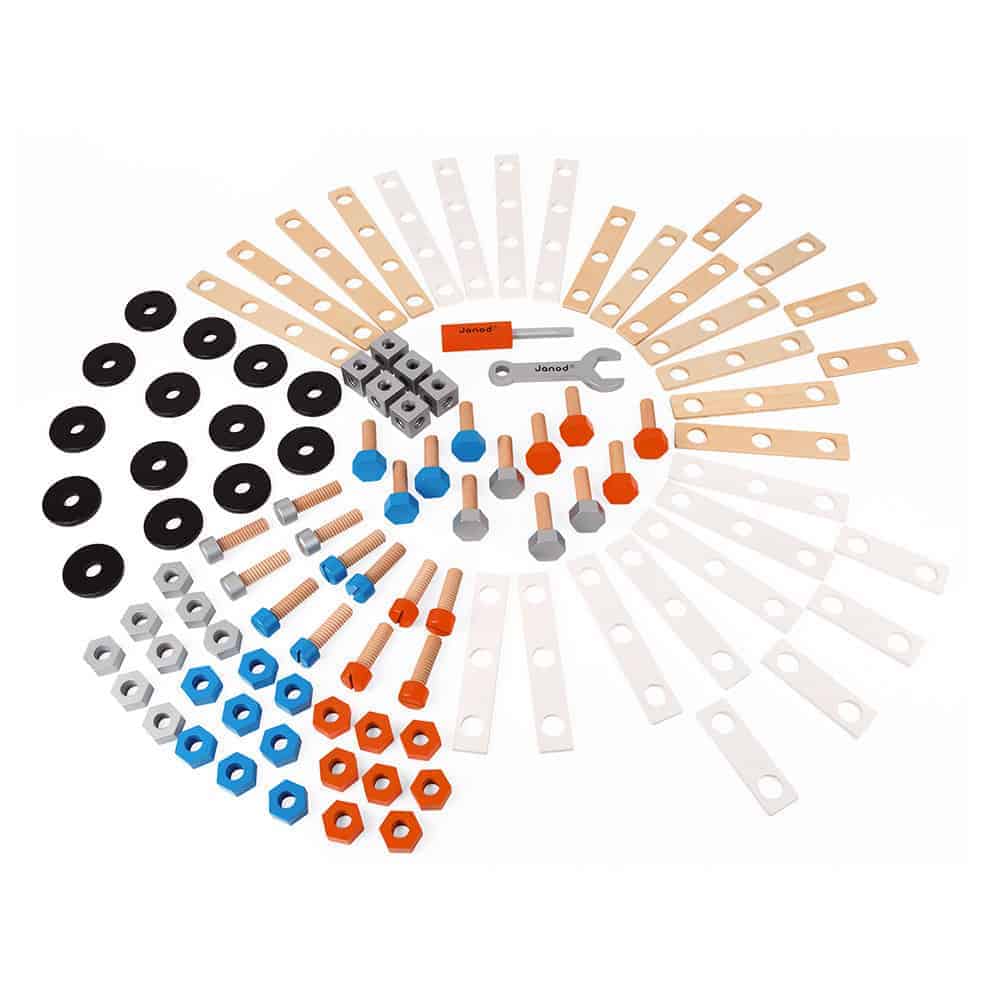 Dieses Set kann als Zubehörset für die Janod Werkband oder eigenständig verwendet werden. Aus Muttern, Schrauben, Scheiben und vielen anderen Teilen baust du alles, was du dir vorstellen kannst. Ein Schraubenzieher und ein Schraubenschlüssel sind im Set enthalten, damit du gleich loslegen kannst.