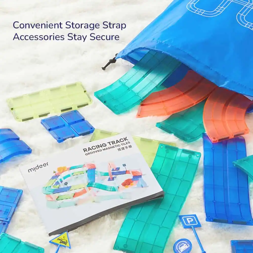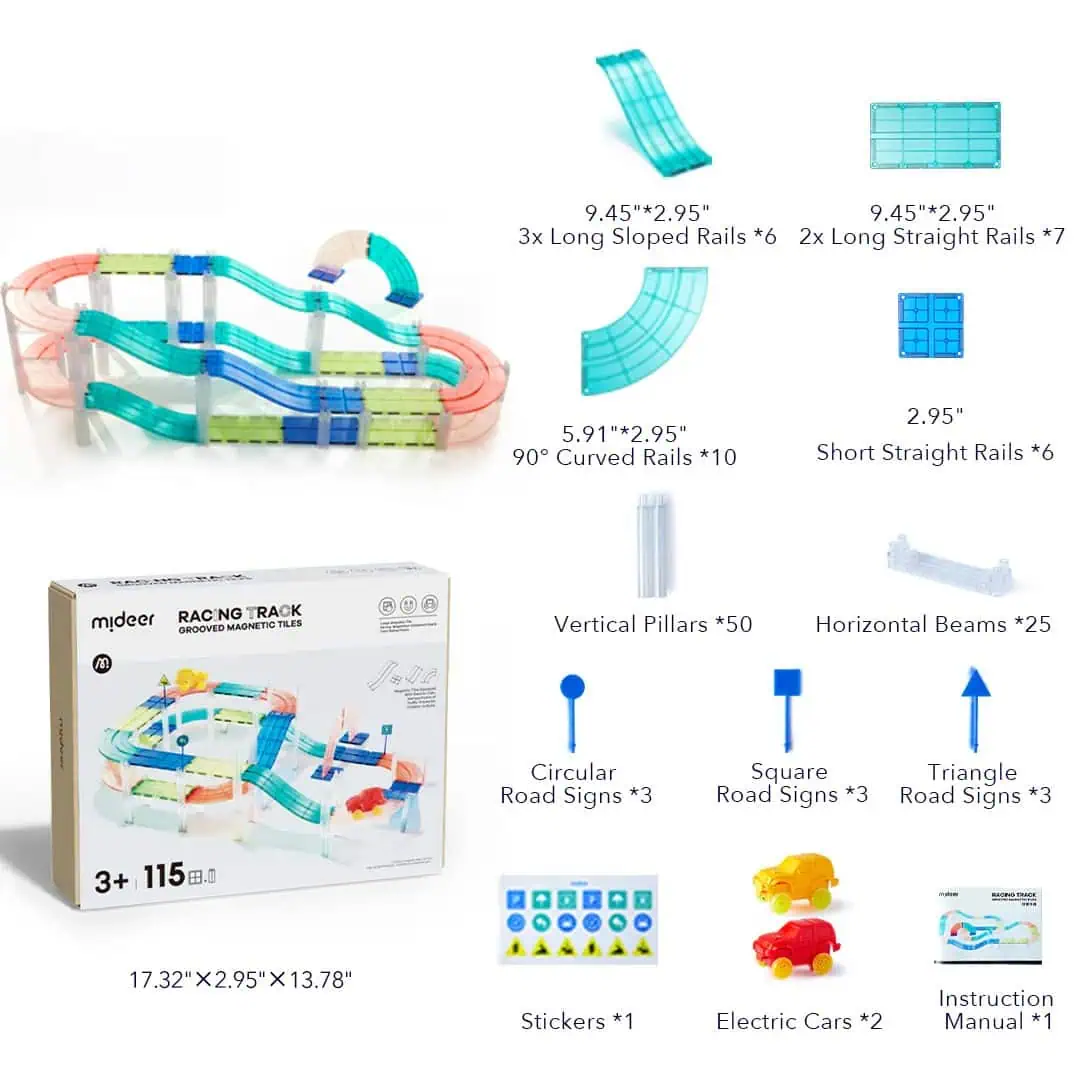 Mideer – Racing Track Grooved Magnetic Tiles – 115 Teile – Magnetische Rennbahn-Bausteine für Kinder