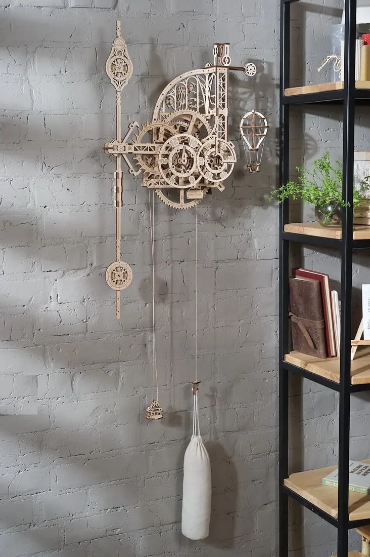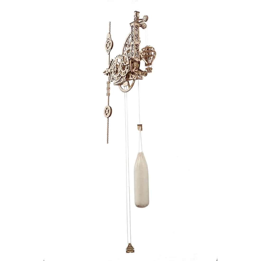 Darüber hinaus drehen sich diese Scheiben gegen den Uhrzeigersinn. Wussten Sie, dass sich vor der Standardisierung einige Uhren im Uhrzeigersinn, andere entgegen dem Uhrzeigersinn bewegten? Die Rolle des „Kuckucks“ übernimmt bei der Ugears Aero-Uhr ein Heißluftballon-Modell. Der schwebende Ballon sinkt schnell nach unten, wenn die Stunde schlägt, um dann im Laufe der nächsten Stunde langsam wieder aufzusteigen.