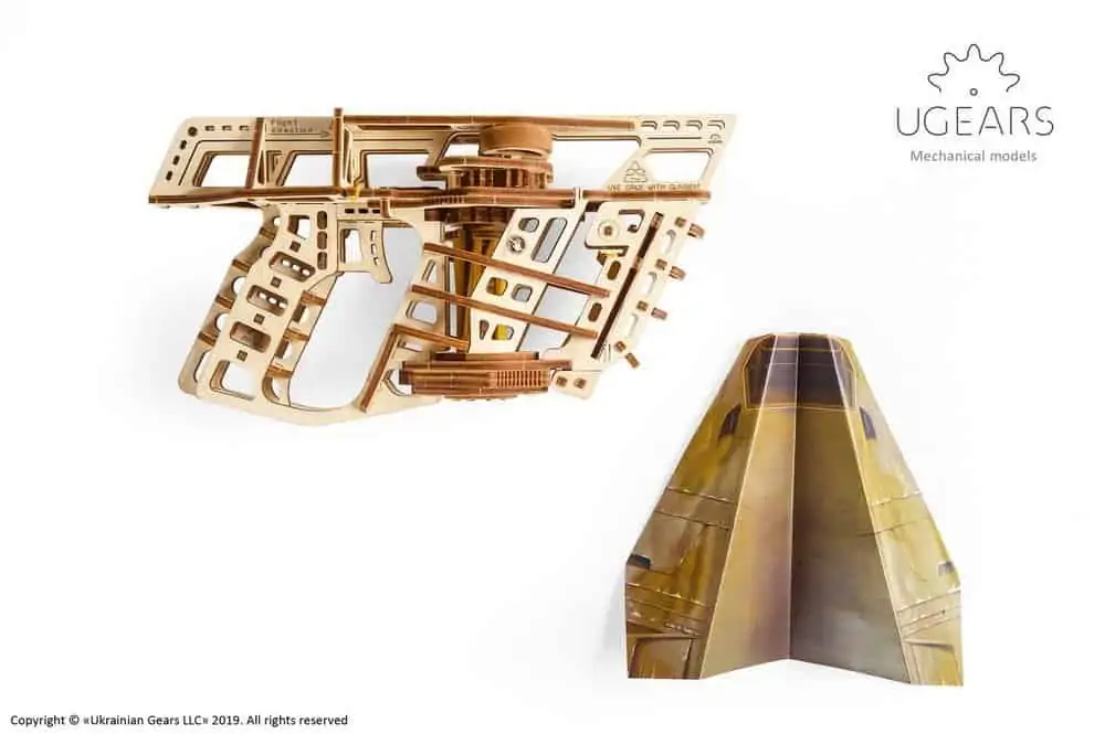 Der Flugzeugstarter ist eine mechanische Starthilfe für leichte fliegende Modellflugzeuge. Drei dieser Flugzeuge sind in dem Bausatz enthalten. Das einzigartige Design des Modells, ein Werk reiner Phantasie, erinnert im Aussehen an etwas aus dem Weltall – ein Raumschiff, eine Raumfähre oder eine Blaster Gun aus einem Science-Fiction Abenteuerfilm. Dieses SciFi-Design wurde im Skeleton Steampunk Stil von Ugears umgesetzt, der Ihnen den Einblick in das Innere des Betriebsmechanismus erlaubt, den Sie mit Ihren eigenen Händen zusammenbauen werden.