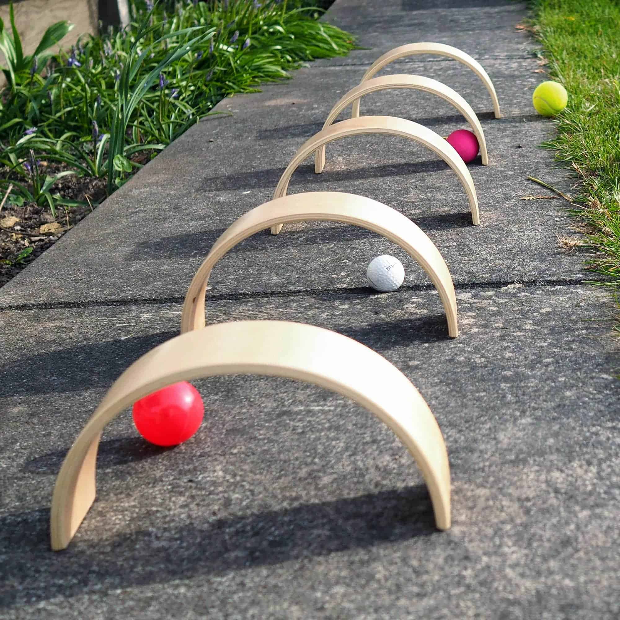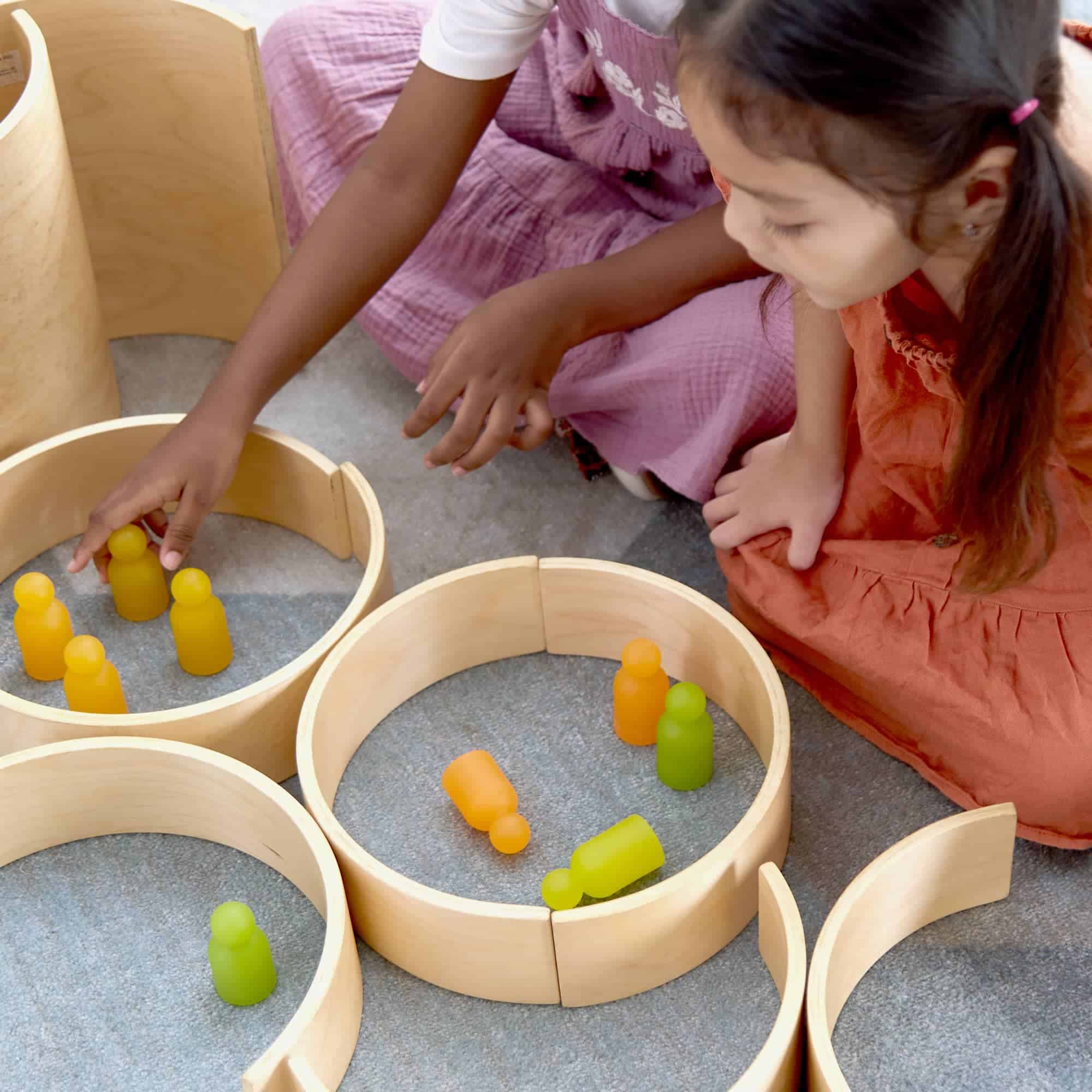 Nesten, stapeln, bauen: 10 Teile (2 Tunnel + 8 Bögen) aus Birkensperrholz, glatt geschliffen – ideal fürs Blockspiel/Unit Blocks. Robust, leicht zu reinigen. Ab 2+.