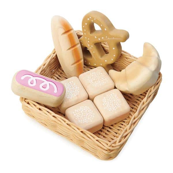 Rollenspiel-Set aus Holz mit 5 verschiedenen Brotsorten zum Spielen in einem Korb.