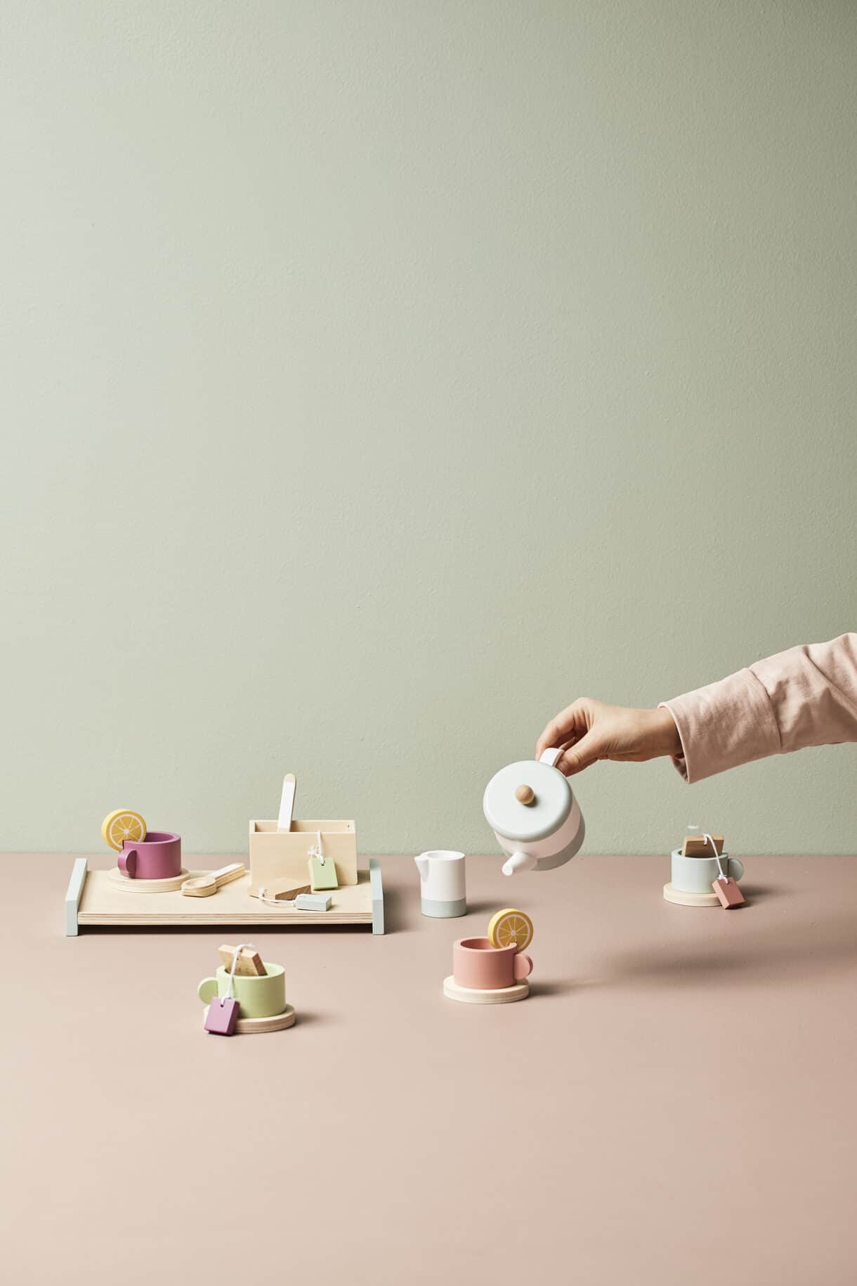 21-teiliges Rollenspiel-Set aus Holz aus der BISTRO Reihe von Kid’s Concept. 4 Teetassen mit Untertasse, zwei Zitronenscheiben, zwei Löffel, sowie Tablett, Teekanne, Milchgießer und Aufbewahrungsbox.