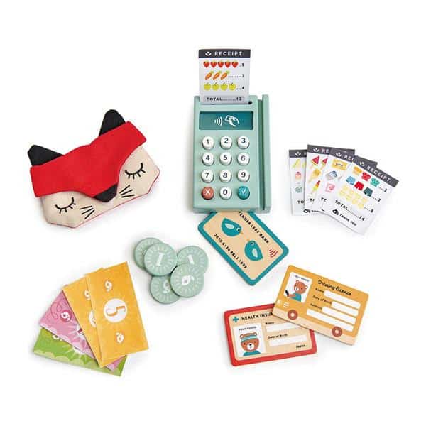 Du willst in deinem Kaufladen mit Kreditkarte zahlen? Dann hol dir dieses Set mit Karten, Münzen und Geldbörse. Passt perfekt zum Kaufladen.