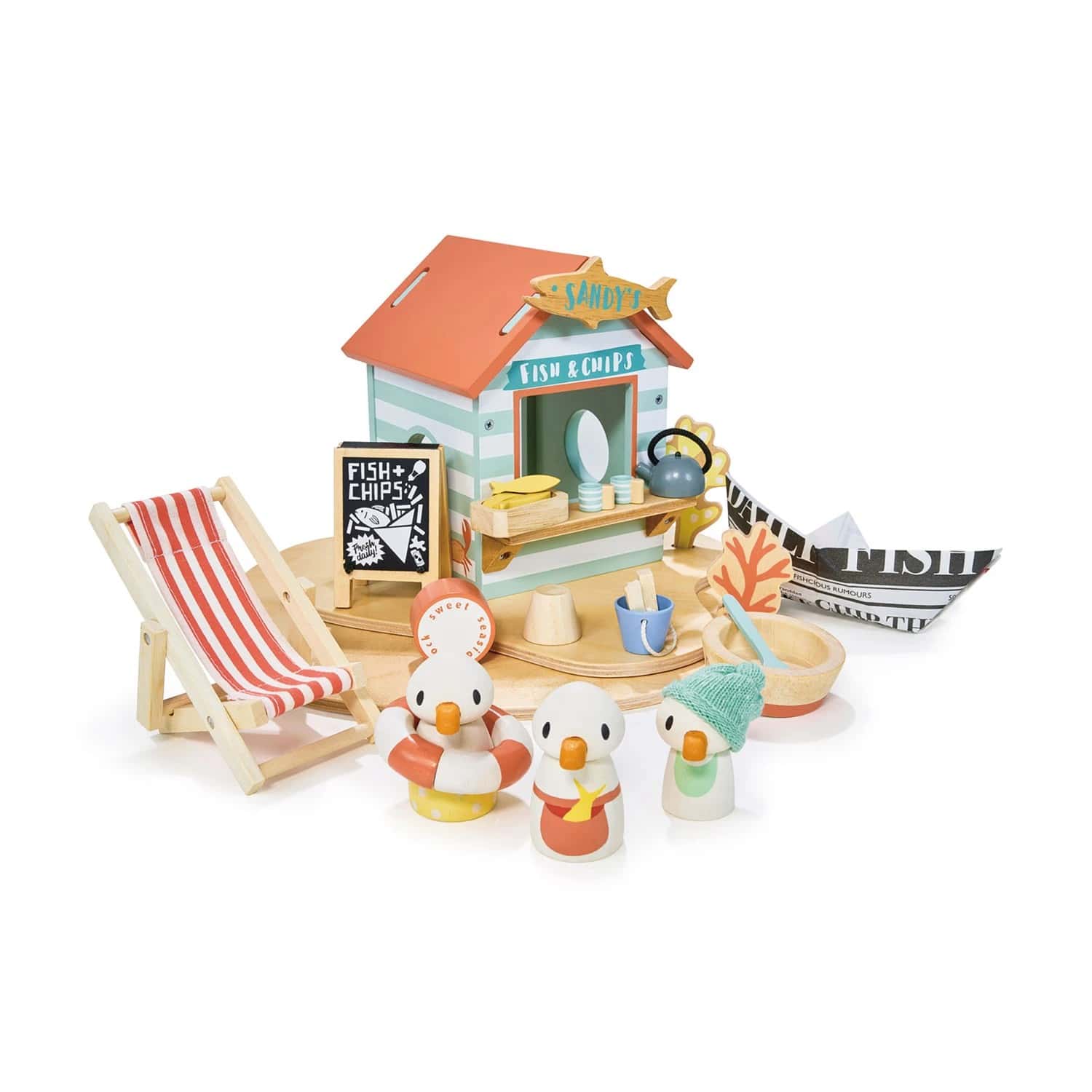 Erlebe Strandabenteuer mit Sandy der Möwe und ihrer Familie von Tender Leaf Toys. Ihre Strandhütte dient als Fisch- und Pommesbude, komplett mit Zubehör für fantasievolles Spielen.