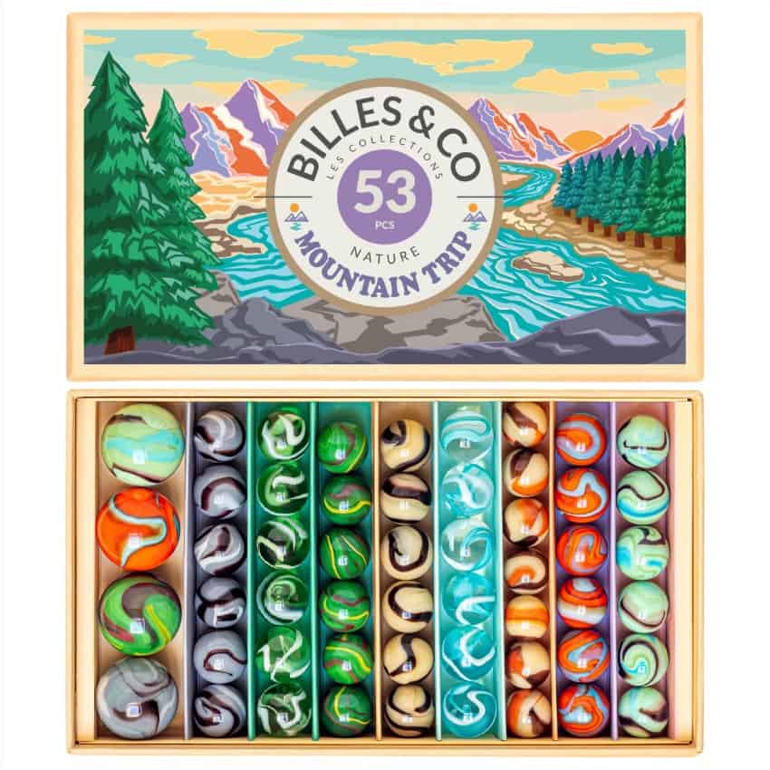 Was kann es an Murmeln schon geben, was so besonders ist. Ein paar Glaskugeln, die du rollen, schieben oder werfen kannst, das klingt nicht so wirklich weltbewegend. Aber wenn du so denkst, kennst du die Murmelsets von Billes & Co noch nicht! Die zeigen dir nämlich, dass Murmeln auch wunderschön sein können. Es müssen keine einfallslosen Glaskugeln sein, die in einem Plastiknetz präsentiert werden. Sie können verspielte Farben aufweisen, die dich zum Träumen anregen, wie das Blau, Grün, Gelb und Grau in der Box Mountain Trip.
