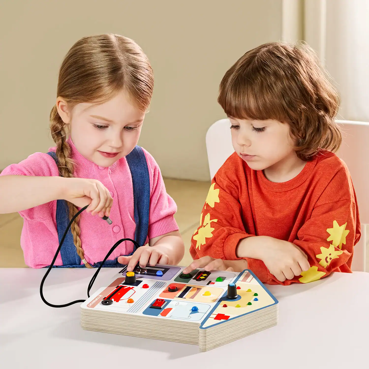 Mit dem Busy Board House von TOPBRIGHT entdecken Kinder ab 3 Jahren, wie Lichtschalter im Alltag funktionieren. Das farbenfrohe Haus ist mit verschiedenen Schaltern ausgestattet – vom Wippschalter über den Drehschalter bis hin zum Schlüsselschalter als Hauptschalter. Jedes Betätigen lässt ein anderes Zimmer aufleuchten und macht das Prinzip von Ursache & Wirkung direkt erlebbar. Gleichzeitig trainieren Kinder ihre Feinmotorik und Hand-Auge-Koordination und sammeln erste Erfahrungen mit Elektrizität.