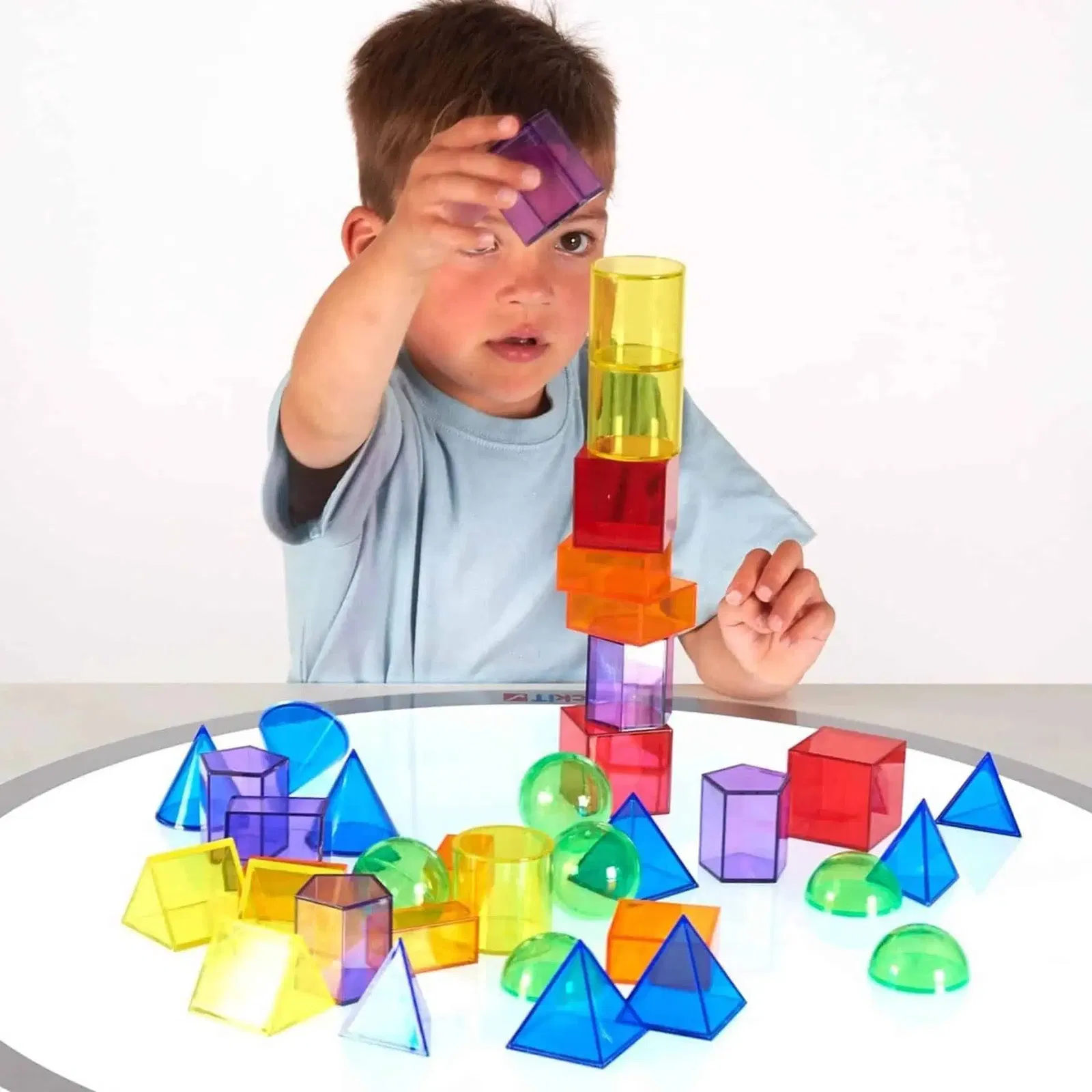 Das TickiT® Set enthält 36 durchscheinende geometrische Formen in 12 verschiedenen Formen und 6 Farben, perfekt für den Einsatz auf Lichtpaneelen und zur Förderung des räumlichen Denkens.