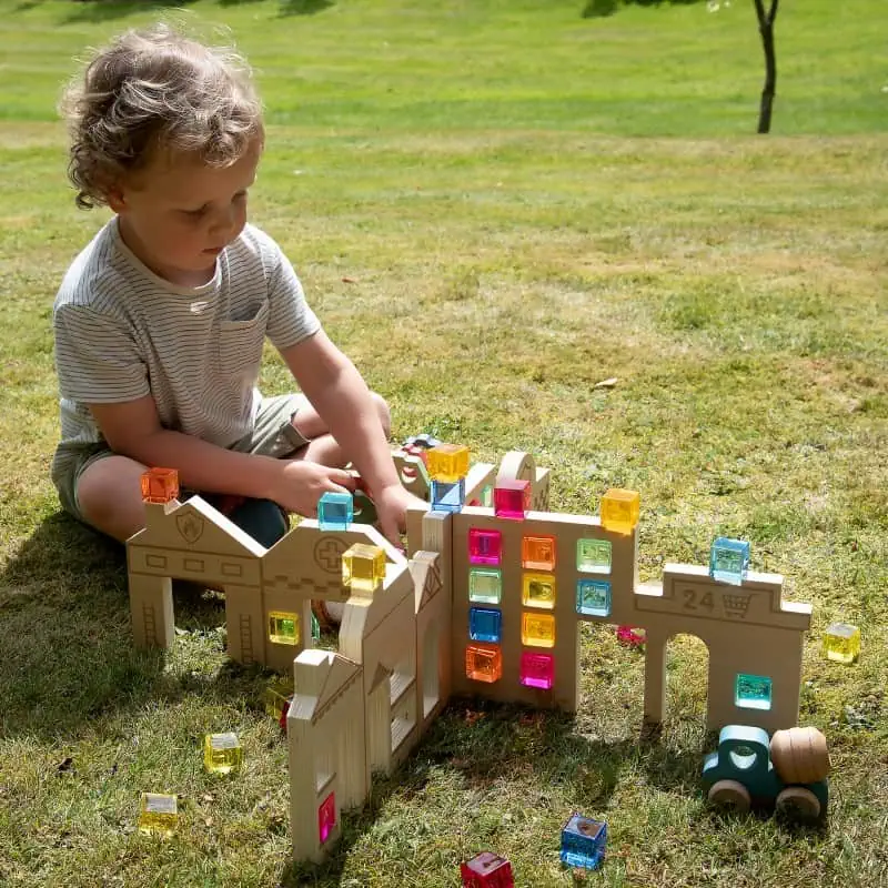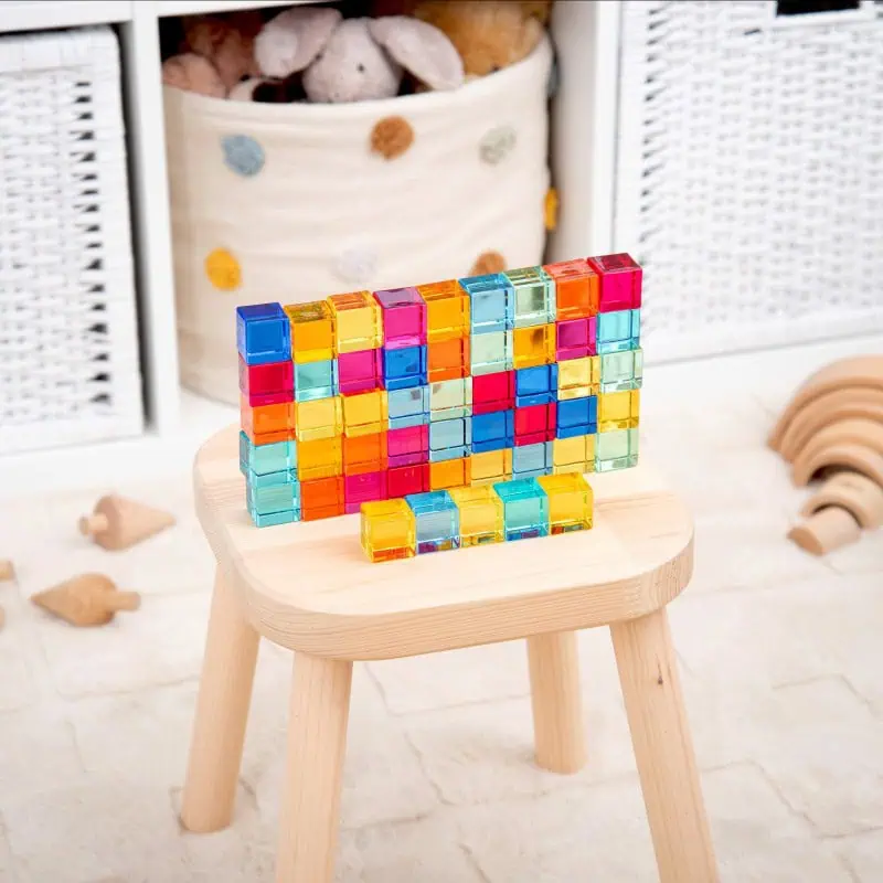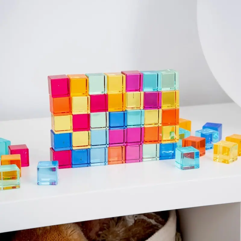 Das TickiT® Edelsteinwürfel-Set enthält 50 transparente Acrylwürfel in leuchtenden Farben – perfekt für sensorische Spiele, Farberkennung und kreatives Bauen.