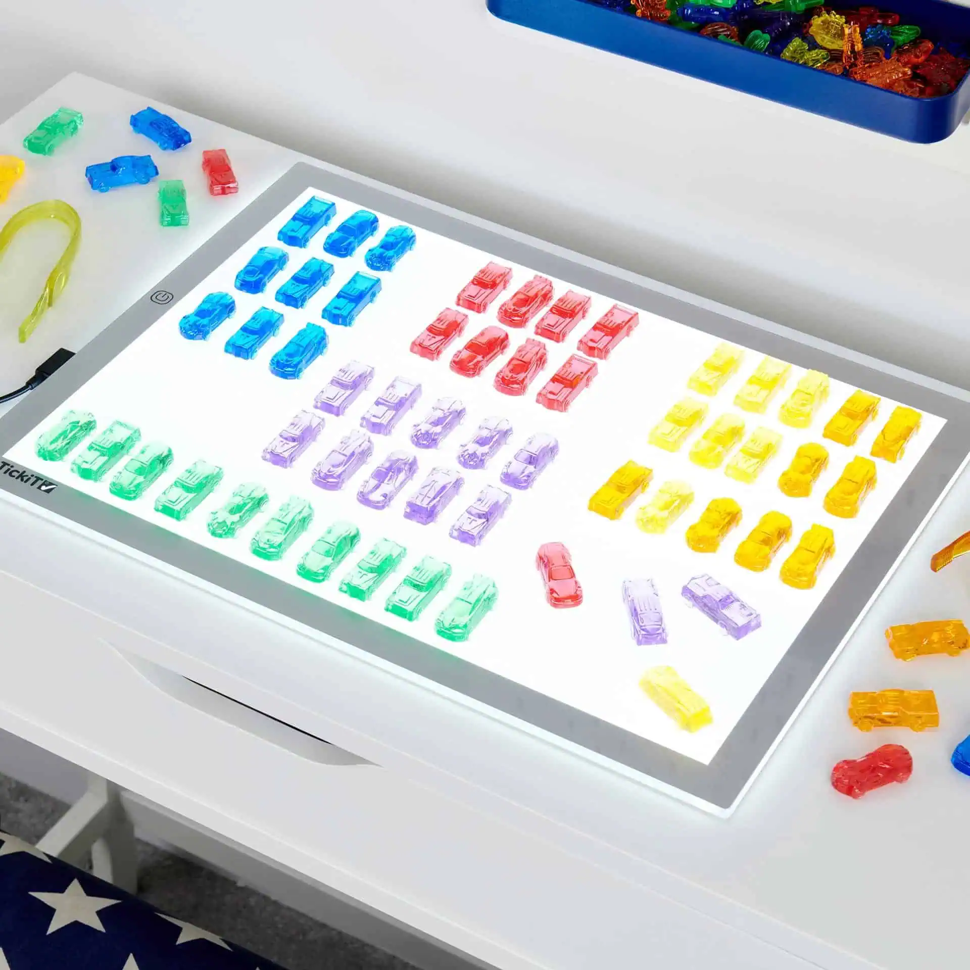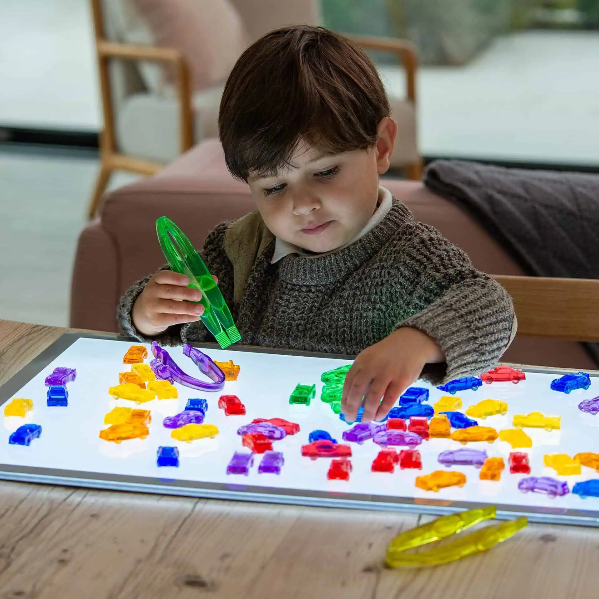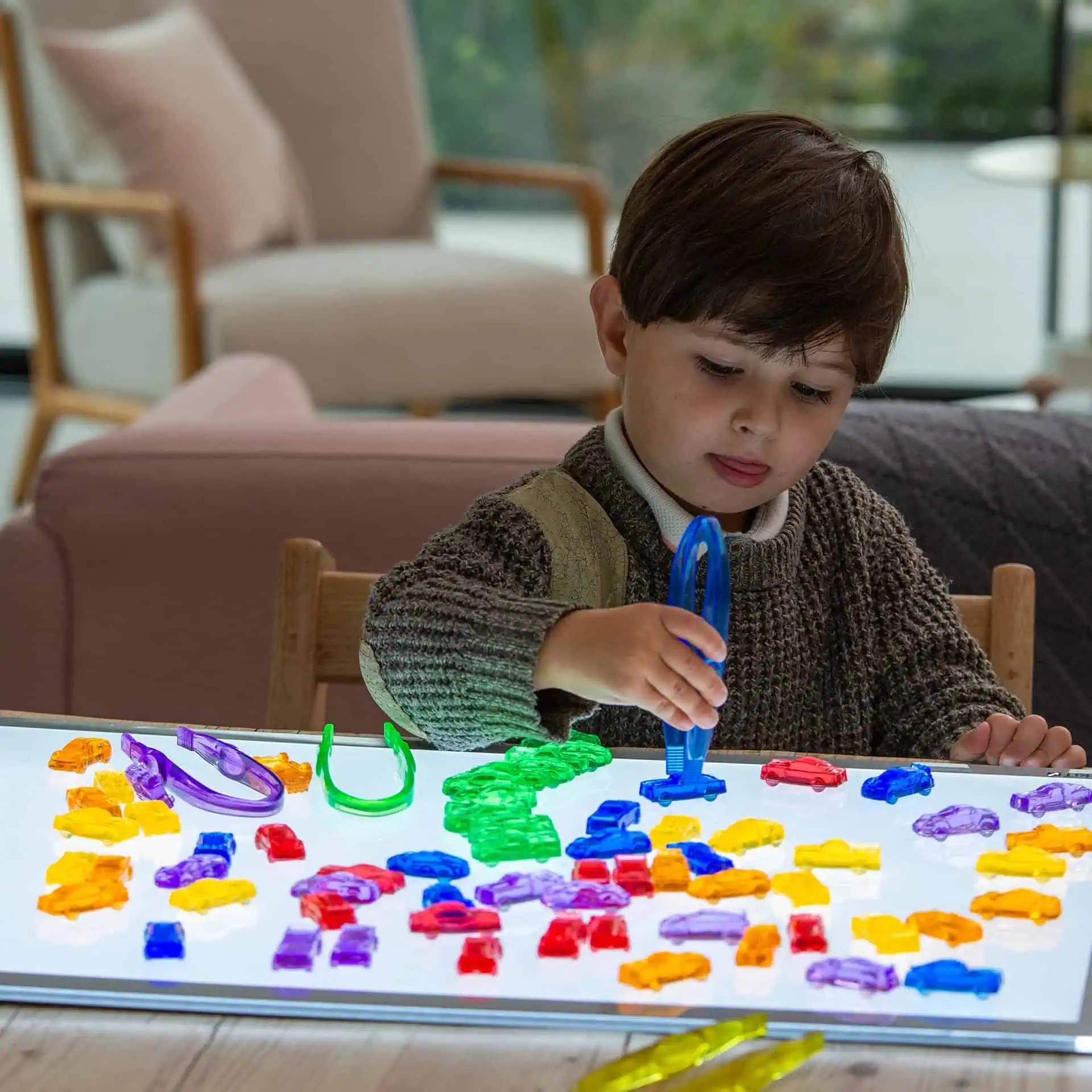 Weil Kinder selbstwirksam lernen: ausprobieren, beobachten, vergleichen – bis der Aha-Moment kommt. Die Materialien verbinden Kreativität und Struktur: Sie eignen sich zum freien Spiel, lassen sich aber auch gezielt als Lern-Impulse einsetzen (z. B. Farben mischen auf dem Leuchtpanel, Muster legen, Mengen erfassen).