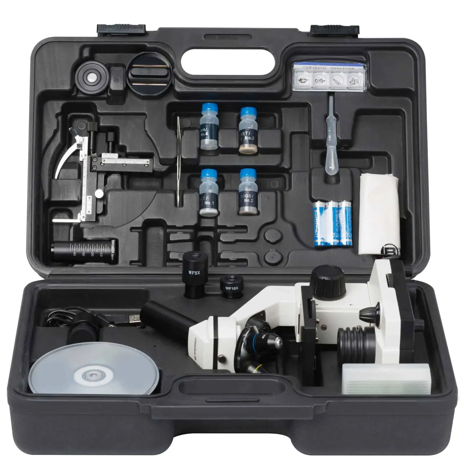 Die Spannungsversorgung erfolgt über Batterien (drei Stück Typ AA), so dass auch ohne Steckdose in der Nähe mikroskopiert werden kann. Neben der Staubschutzhülle sind im Zubehör schon 5 Dauerpräparate und 5 leere Objektträger und Deckgläschen zur Anfertigung eigener Präparate enthalten. Die Präparate kann man mit der im Lieferumfang enthaltenen hochwertigen HD Okularkamera auf dem PC-Monitor betrachten. Die beigefügte Windows-Software (Win 8/10 kompatibel) ermöglicht auch das einfache Aufnehmen von Fotos und Videos am PC. So kann jeder seine Ergebnisse dokumentieren oder mit anderen teilen!