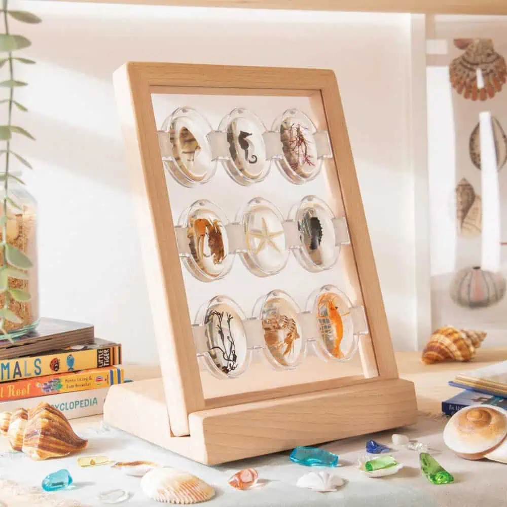 Sichtbar, sicher, sortiert: Display-Ständer für 9 Specimen Stones mit Buchenholz-Basis und robustem Polycarbonat – ideal für Sachkunde & Beobachtung. Ab 2+.