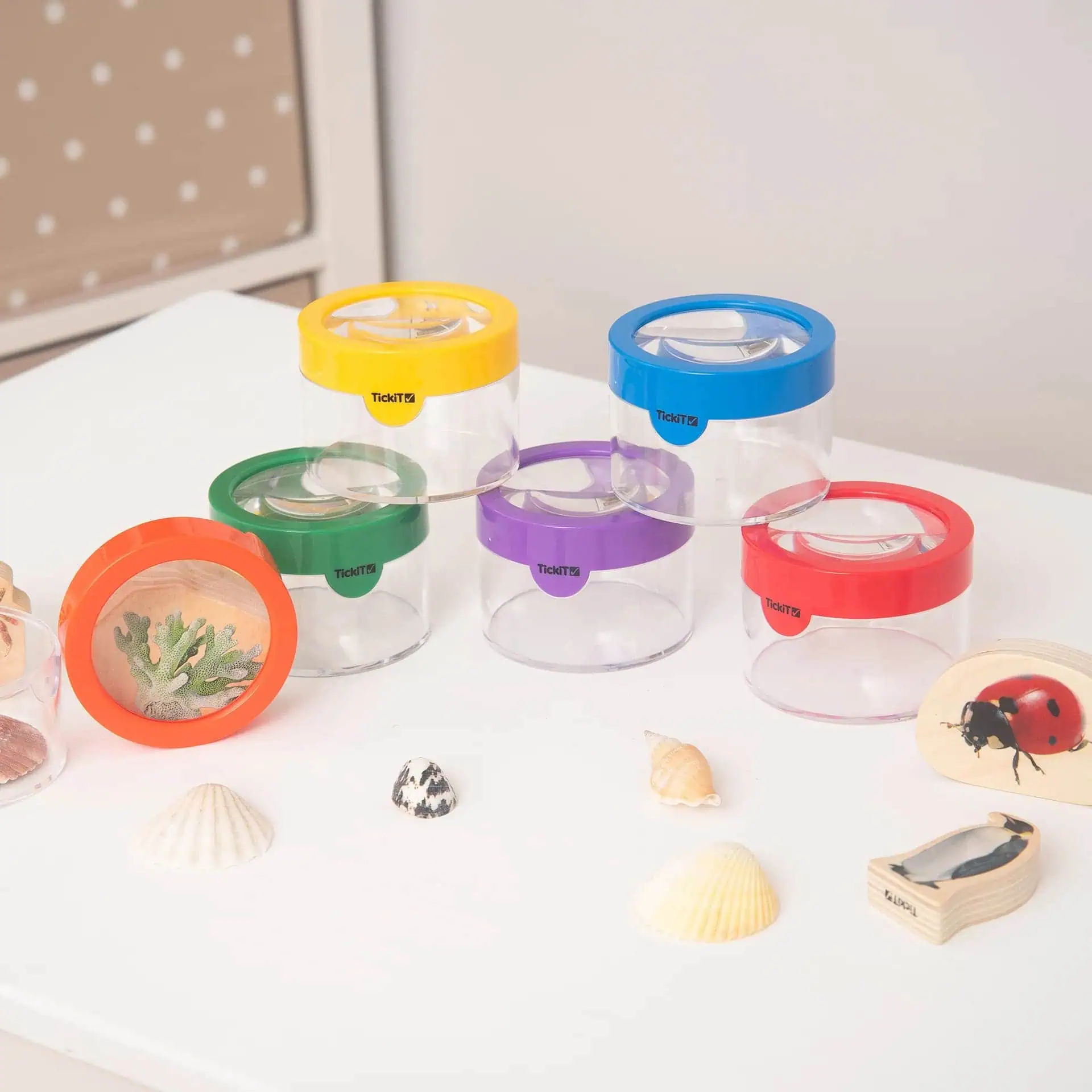 Die TickiT® Regenbogen-Zuschauer ermöglichen Kindern, natürliche Objekte sicher zu sammeln und mit 3-facher Vergrößerung zu betrachten. Set aus 6 bunten Behältern mit aufsteckbaren Deckeln.