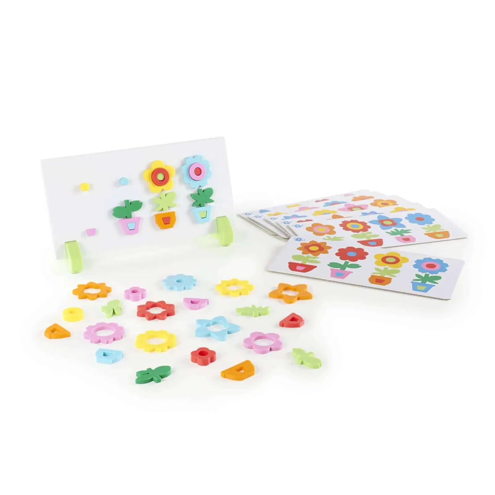 Flower Pot Sort & Match macht Mustererkennung und Sequenzieren greifbar: Kinder legen die magnetischen Blumenteile nach Farbe/Form und Vorlage auf das selbststehende Board. Die eingebetteten Magnete führen die Teile sicher in Position – das reduziert Frust und fördert präzises Arbeiten. Die 12 Aufgaben (6 doppelseitige Karten) reichen von einfachen Farbreihen bis zu komplexeren Mustern. Nach dem Spielen verschwindet alles ordentlich im kompakten Kasten – ideal für Kita, Vorschule und Zuhause.