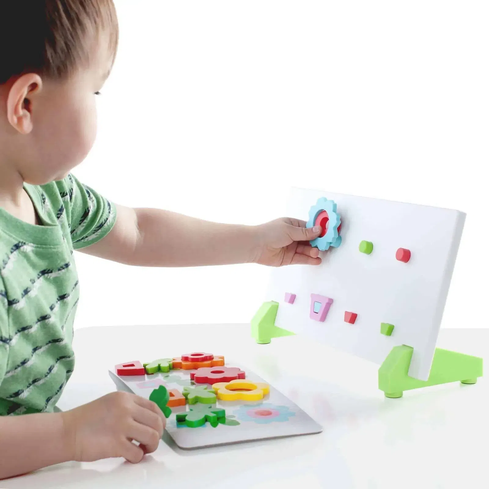 Magnetisches Sortier- & Muster-Spiel: 44 Teile, 6 doppelseitige Musterkarten, selbststehendes Board mit Metallrückwand. Farben, Formen, Sequenzen trainieren. 34,9×31,1×7,6 cm. Ab 3+.