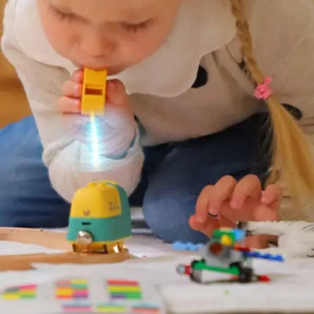Coding Express bringt Kindern ab 3 Jahren spielerisch Programmieren näher: Einfach die Farb-Stickers auf die Holzschienen kleben – der Zug erkennt sie und führt Kommandos aus (z. B. Richtung, Tempo, Sounds, Sonder-Szenarien). Dank LED-Licht, Sound-, Infrarot- und Farbsensor entstehen lebendige Settings auf dem Boden. Neben dem Track-Modus gibt es einen Free-Modus: per Pfeifen/Blasen beschleunigen oder mit der Hand interagieren – ganz ohne Bildschirm.