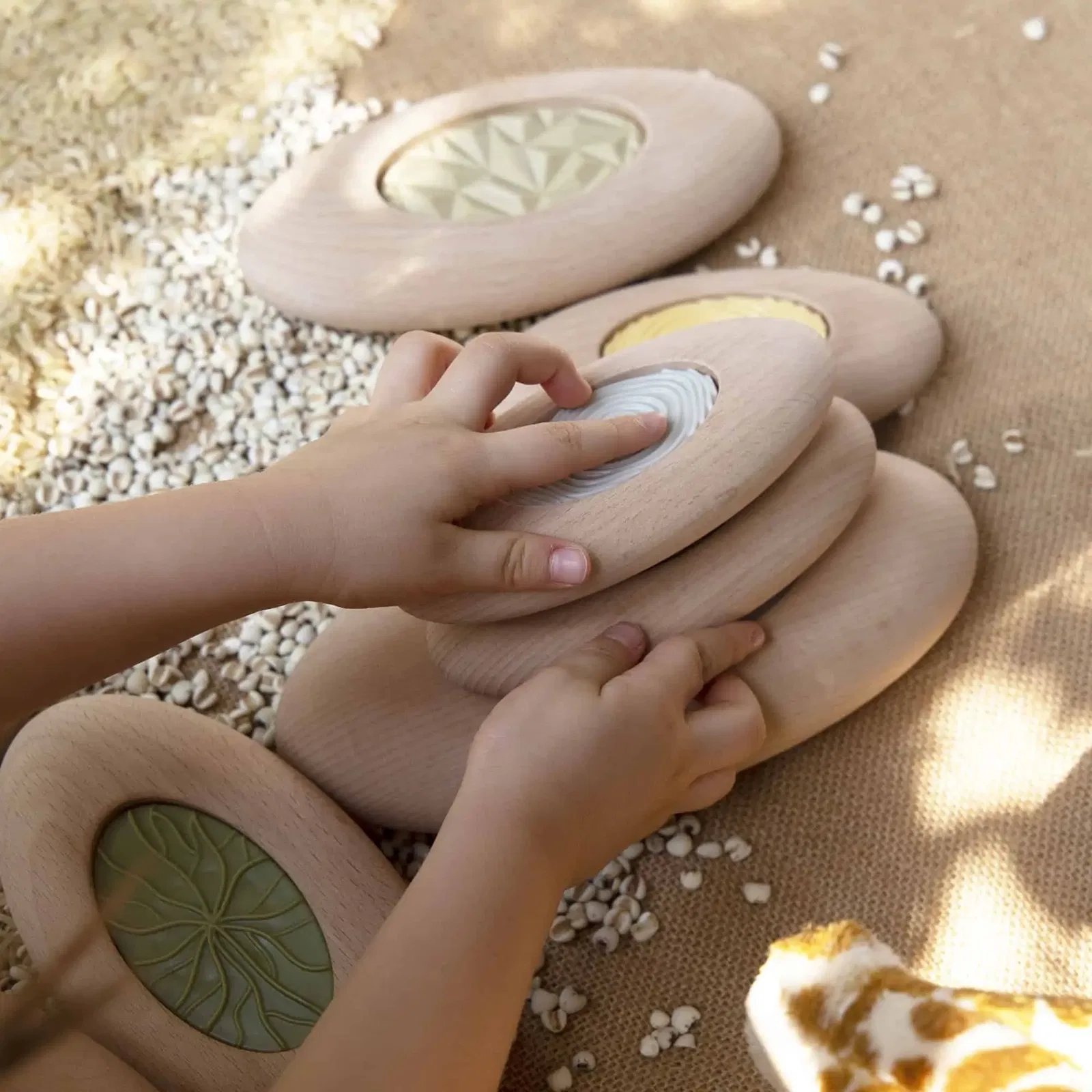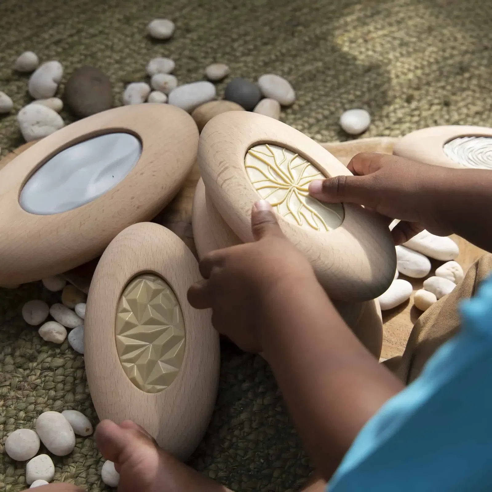 Tasten & balancieren: 10 übergroße Holz-Steine mit strukturierten Inlays. Muster legen, Türme bauen, Feinmotorik stärken. Größen 13–19,5 cm Breite. Ab 2+.