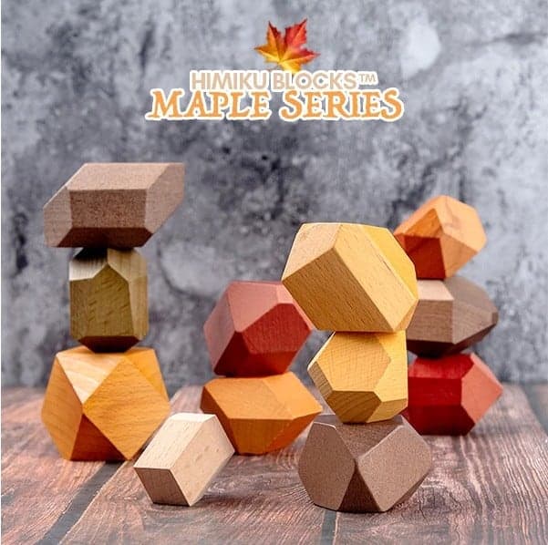 12 einzigartig geformte, handgeschnitzte Himiku-Blöcke, lackiert mit ungiftigen, wasserbasierten Maple-Farben.