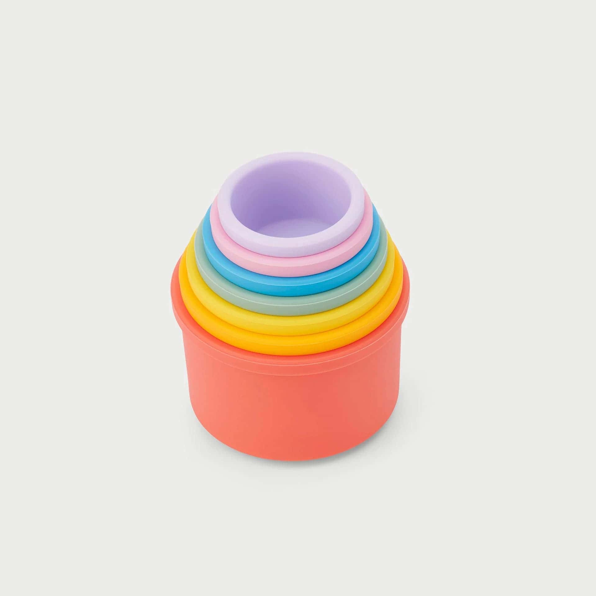 7 Stapelbecher aus lebensmittelechtem Silikon in Regenbogenfarben, mit 1–7 Löchern und erhabenen Kreisrippen. Ideal zum Stapeln, Balancieren, Zählen und sensorischen Spielen – ab Geburt.
