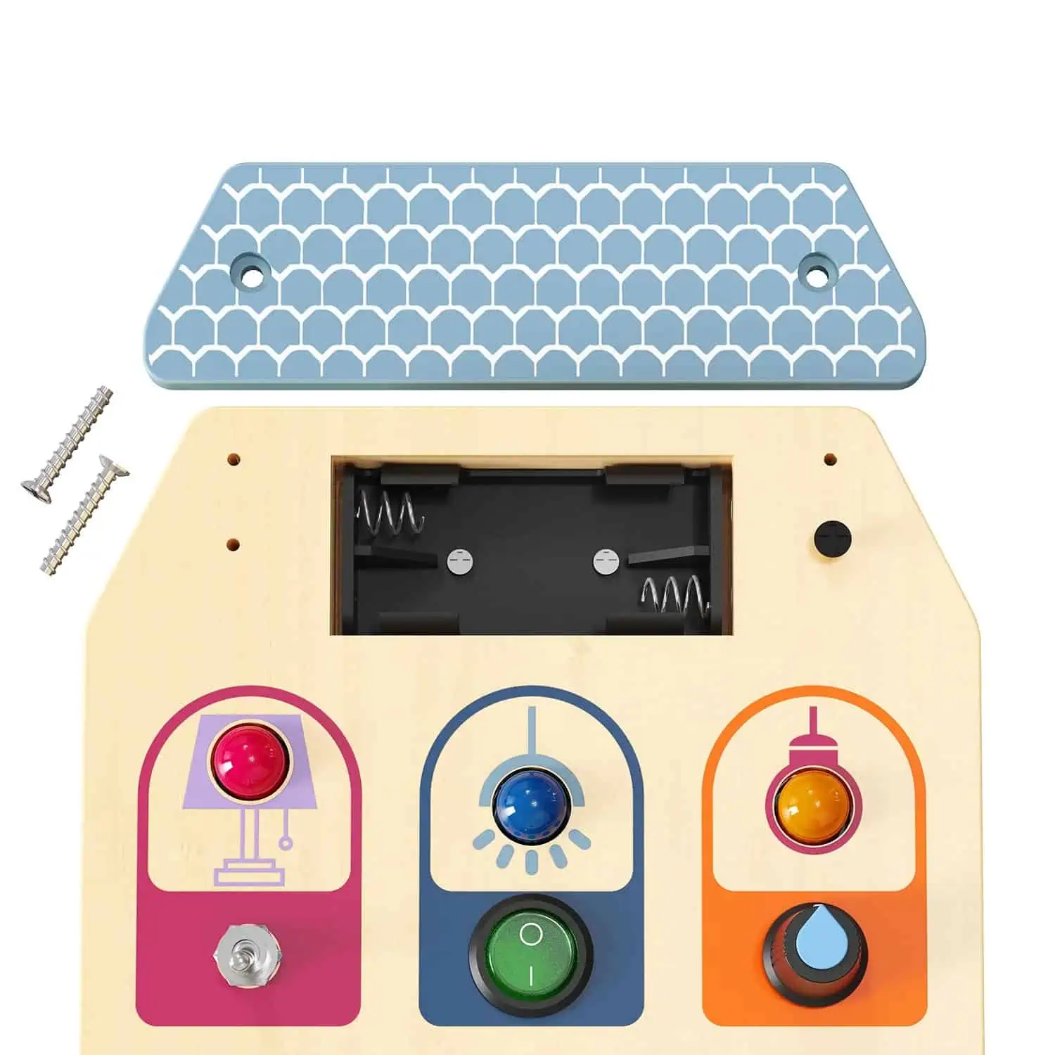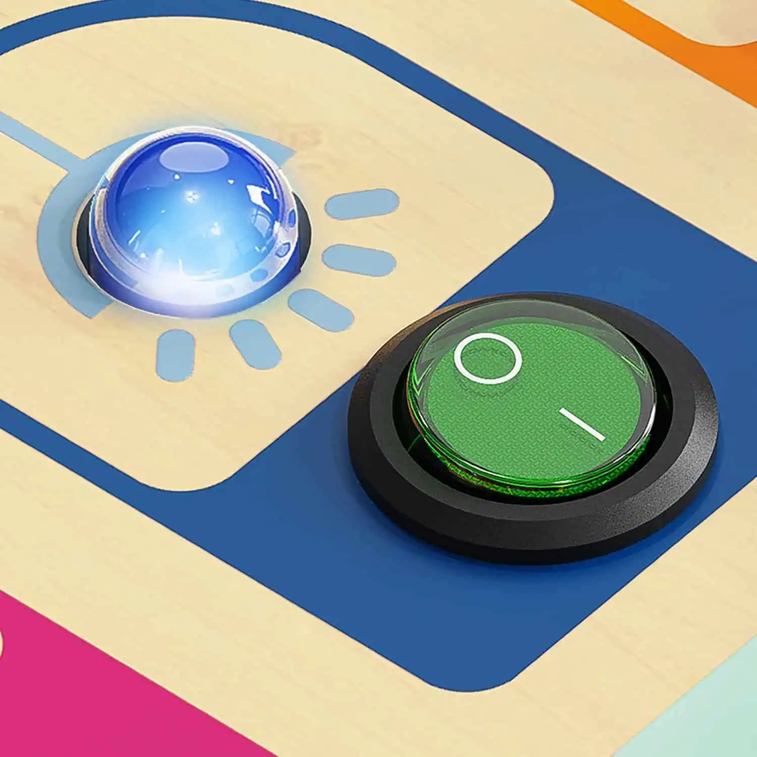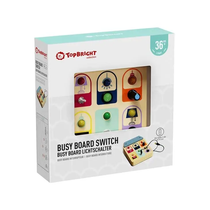 Das TOPBRIGHT Busy Board Lichtschalter ermöglicht Kindern ab 36 Monaten, verschiedene Alltagsschalter zu bedienen. Fördert spielerisch Feinmotorik und Verständnis für Elektrizität.