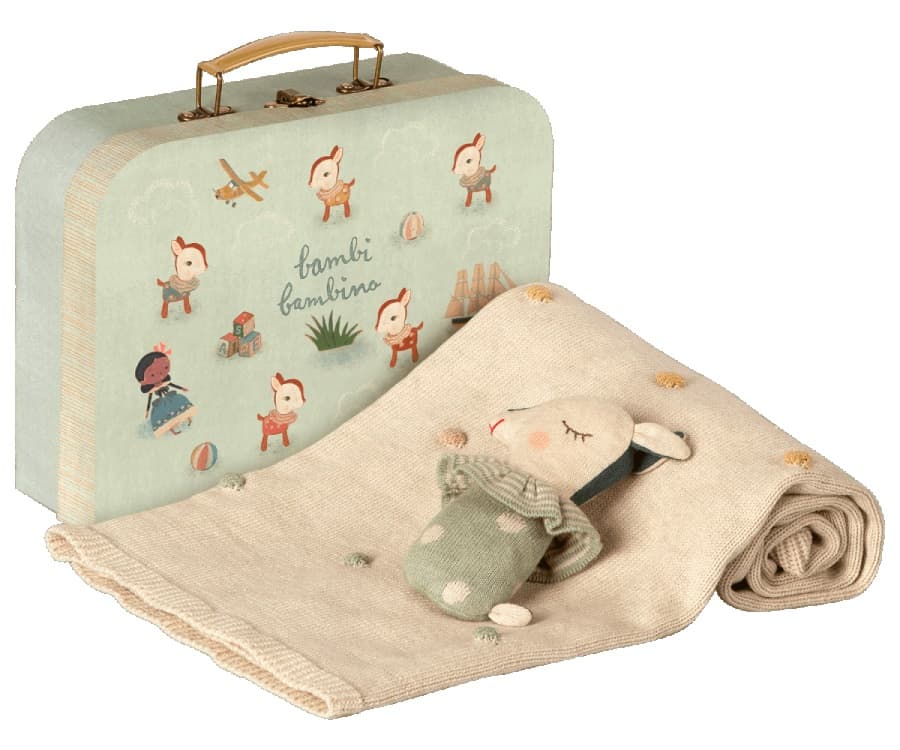 Ein zauberhaftes Geschenkset für Babys! Enthalten sind eine niedliche Bambi-Rassel und eine weiche Strickdecke aus OEKOTEX-Baumwolle. Das Set wird in einem liebevoll handgefertigten und schön dekorierten Koffer präsentiert. Die Decke hat eine Größe von 70×90 cm, die Rassel misst 15 cm in der Höhe und der Koffer ist 26 cm breit und 8 cm hoch. Ein perfektes Geschenk, um das Baby zu verwöhnen und zu begeistern!