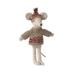 Das Set Strickpullover & Mütze – Mama Maus hält die Maileg Mama/Papa- und Oma/Opa-Mäuse in der kalten Jahreszeit kuschelig warm. Der weiche Strickpullover mit traditionell inspiriertem Muster und die passende Strickmütze verleihen jeder Maus einen typisch skandinavischen Winterlook. Ideal, um Winterspaziergänge, Schneetage und gemütliche Abende im Maileg-Schloss oder Farmhouse nachzuspielen.