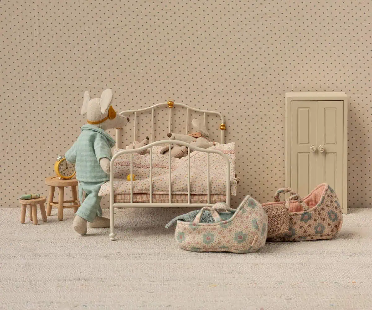 Das Maileg Vintage-Bett in Offwhite verleiht jedem Puppenhaus einen Hauch Nostalgie. Aus Metall und Holz gefertigt, mit enthaltenem Polster, misst es ca. 17 × 11 × 9,5 cm. Ein liebevolles Möbelstück für fantasievolle Rollenspiele, das Fantasie, Empathie und Kreativität fördert – empfohlen für Kinder ab 3 Jahren.