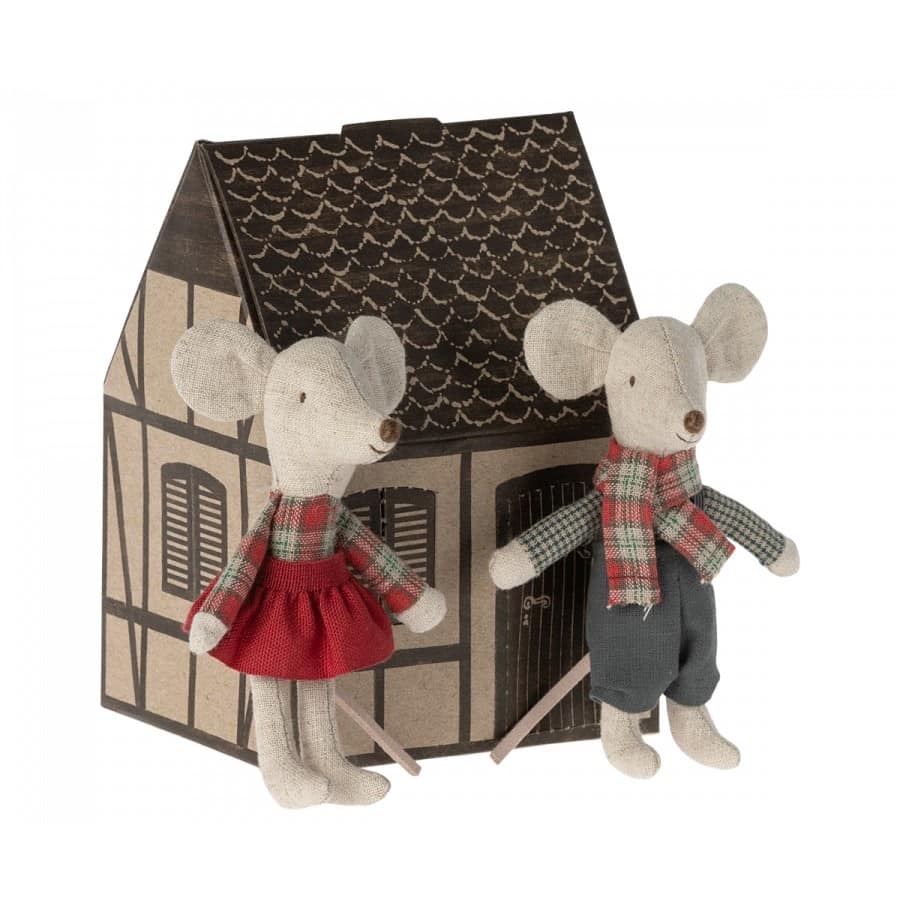 Zwillingsmäuse von Maileg, bereit für Winterabenteuer, verpackt in einem spielbaren Papierhaus.