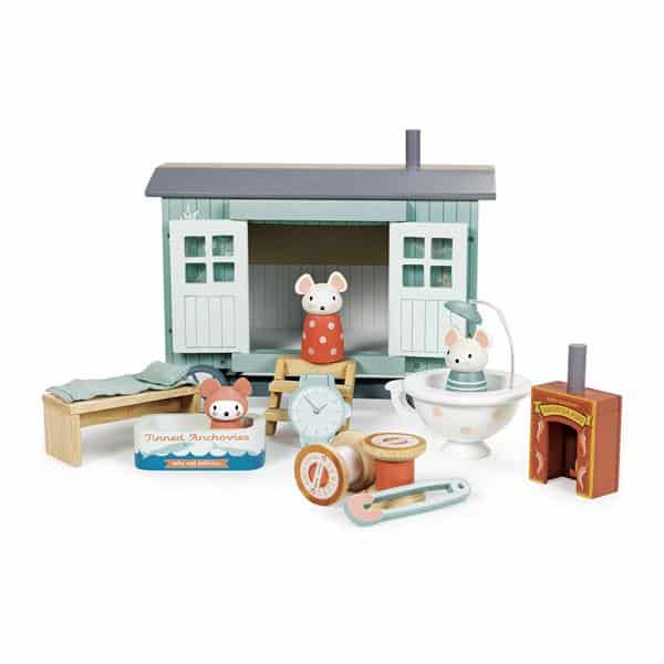 Der Tender Leaf Toys Schäferwagen ist ein Rollenspielset aus Holz für Kinder ab 3 Jahren. Lass die kleine Mäusefamilie den schönsten Campingurlaub erleben. Dafür sind sie nämlich bestens ausgestattet. Die insgesamt 3 Familienmitglieder nehmen eine Dusche in der Teetasse, sitzen auf Garnspulen und das Baby schläft in einer Sardinendose. Eine Konservenbüchse dient als Holzofen, die Handtücher hängen an einer Sicherheitsnadel und eine kleine Armbanduhr wird zu einer großen Küchenuhr. Diese Mäuse wissen, wie man aus wenig ganz viel machen kann.