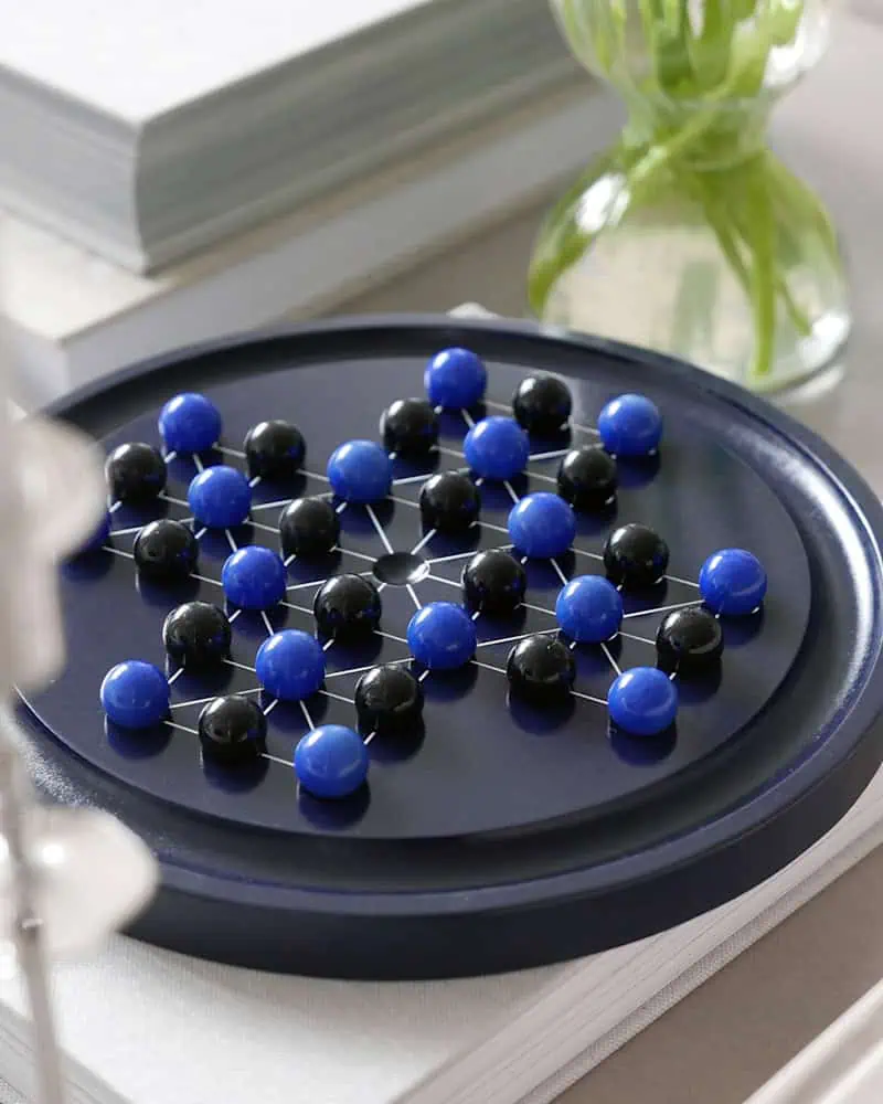 Solitaire Classic kombiniert ein Holzbrett mit Keramik-Murmeln in einer dekorativen Box. Startaufbau setzen, Züge planen, Lücken öffnen – ein stilles, meditatives Taktikspiel für Kinder & Erwachsene.