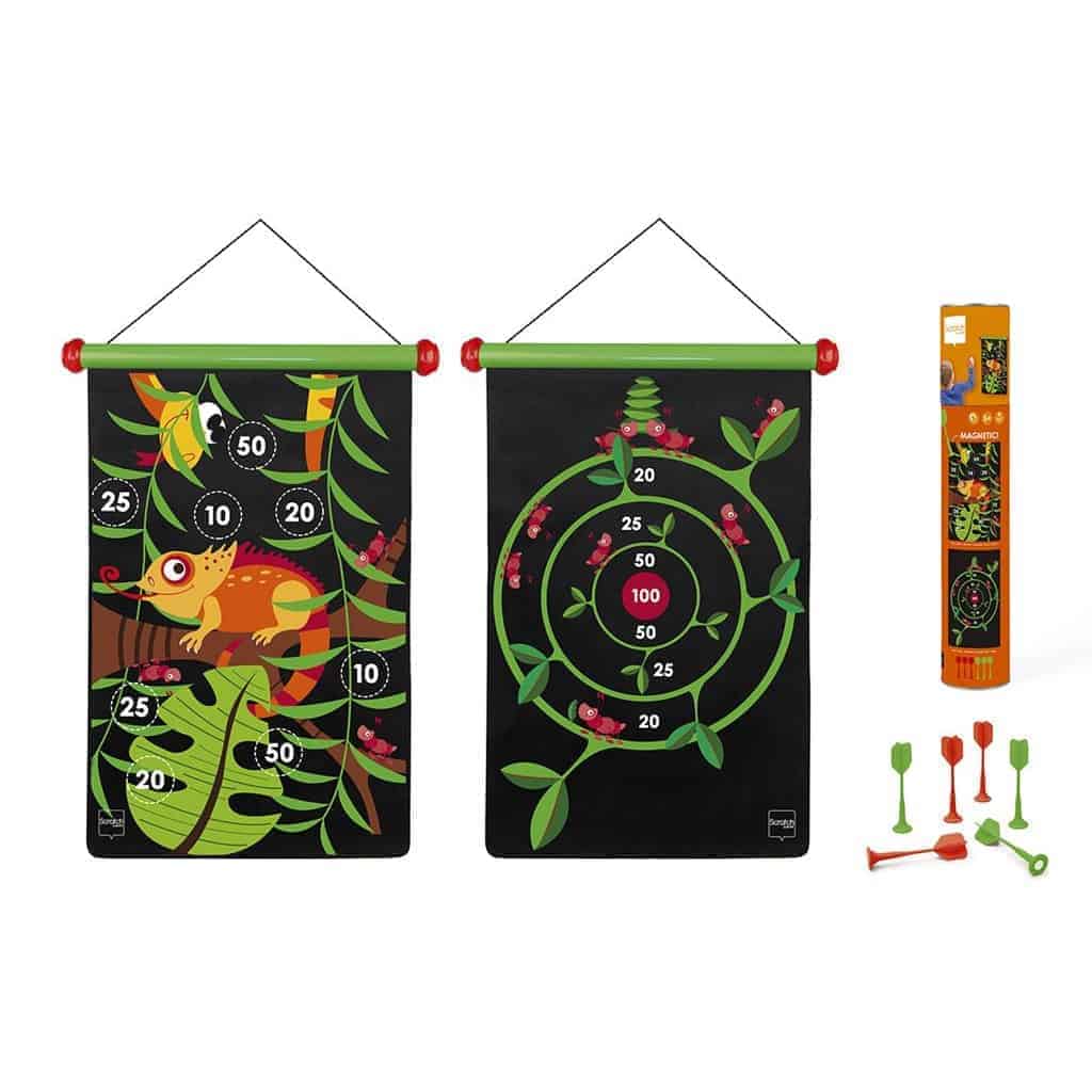 Die magnetische Matte im Dschungel-Design kann beidseitig aufgehangen werden. Die Zielscheibe auf der einen Seite ist in ihrem Layout einer echten Dartscheibe ähnlich, wobei die Werte stark vereinfacht sind. Auf der anderen Seite gilt es, die mit Punktzahlen versehenen Kreise zu treffen.