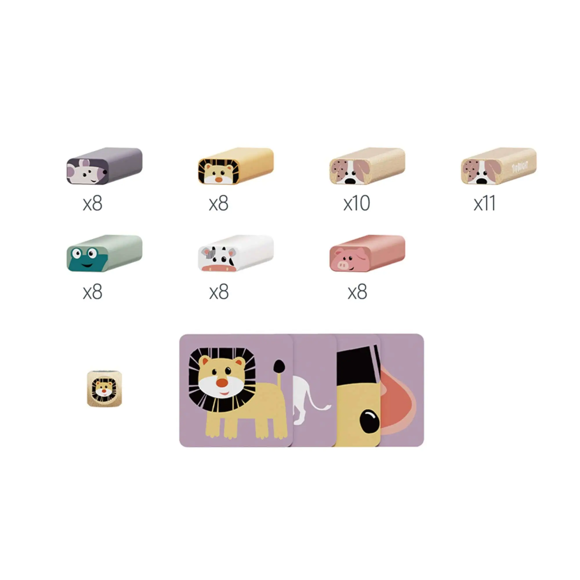 Inhalt: 51 farbige Holzklötzchen mit Tiermotiven, 1 Holzwürfel, 24 Spielkarten