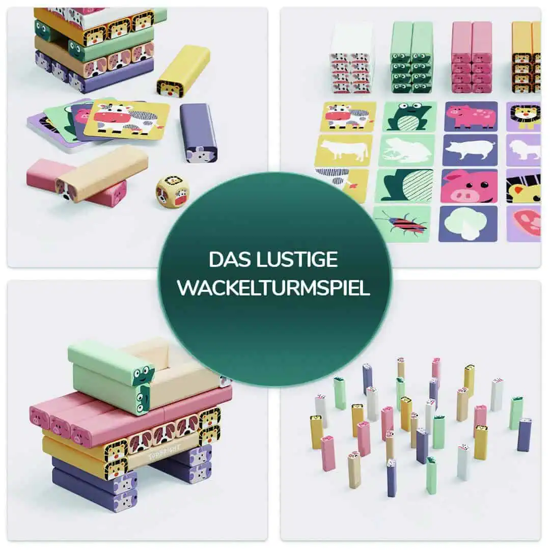 Lustiger Wackelturm mit Tiermotiven – stapeln, bauen, dominieren! 3-in-1 Spielspaß aus Holz mit Würfel & Karten. Fördert Geschicklichkeit & Fantasie ab 3 Jahren.