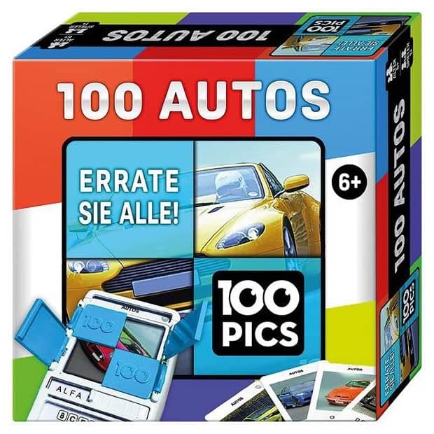 Prägende Autos aus den letzten Jahrzehnten und brandneue Modelle warten im 1ß00 PICS Bilderrätsel darauf, von dir erraten zu werden. Reicht die Buchstaben Kombination oder brauchst du einen oder mehrere Bildausschnitte, um das richtige Modell zu erraten. Kannst du alle 100 Auto-Modelle erraten? 100 PICS ist die clevere Kombination aus Wort- und Bilderrätsel, verpackt in der einzigartigen Quiz-Box. Die Spieler müssen 100 Bildkarten nur anhand von Buchstabenkombinationen oder mit verborgenen Bildinformationen erraten. Der integrierte Schieber enthüllt nach und nach die Lösung. Die geniale Quiz-Box mit vier aufklappbaren Fenstern ist kompakt, praktisch und bietet viele Spiel-Möglichkeiten.
