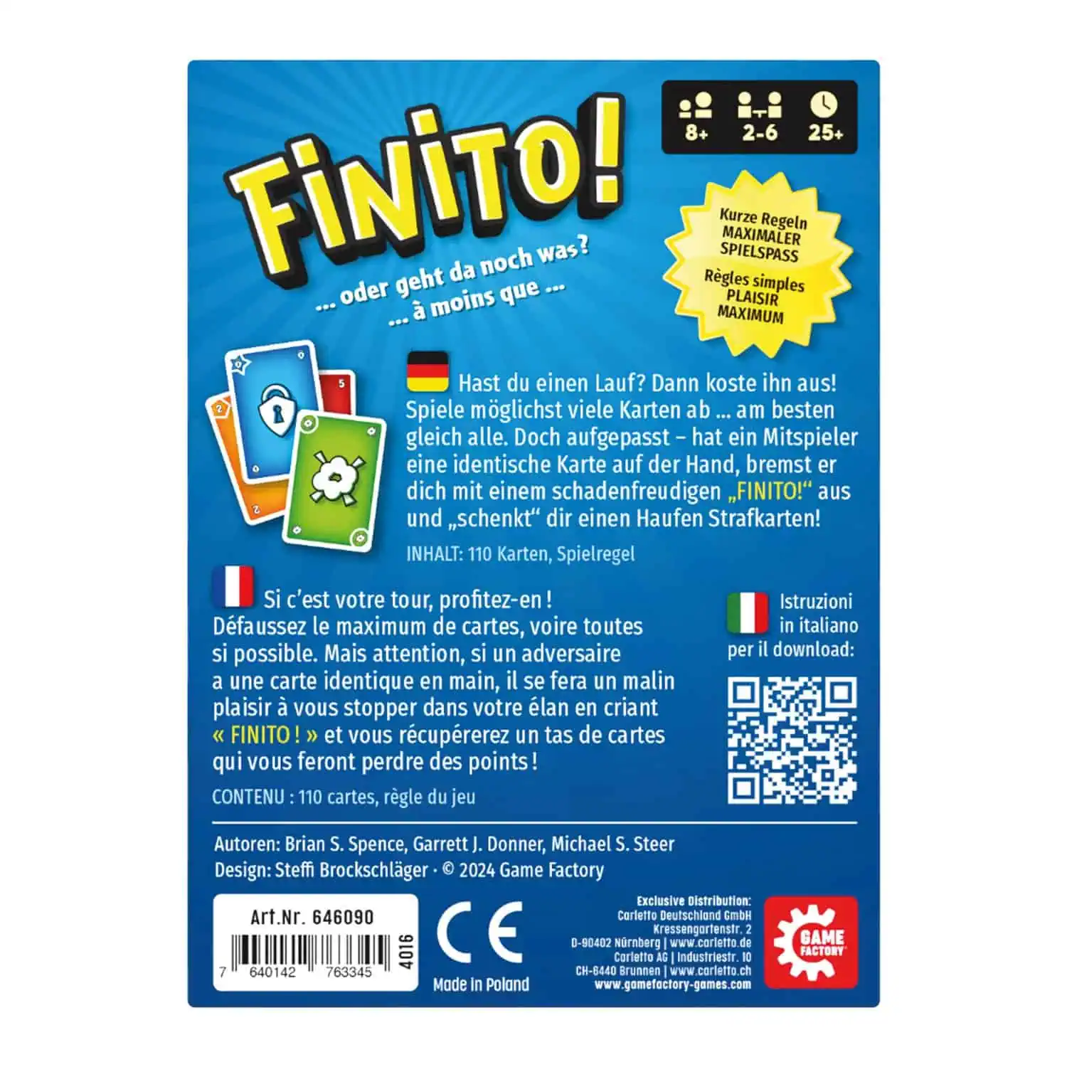 Ein schnelles Kartenspiel voller Spannung und Emotionen. Kurze Regeln, großer Spaß. Sag „Finito!“ und genieße den Triumph, indem du Gegner mit Strafkarten überhäufst.