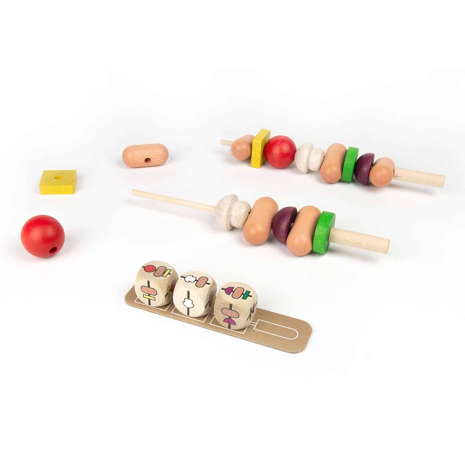 Beim Grillparty-Spiel treten 2 Spieler ab 3 Jahren gegeneinander an. Das Ziel des Spiels ist es, die Grillzutaten nach den Vorgaben des Würfels auf den Spieß zu stecken.
