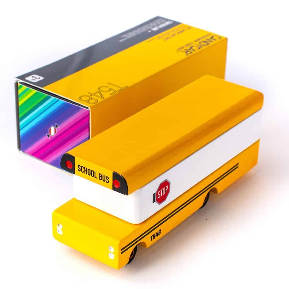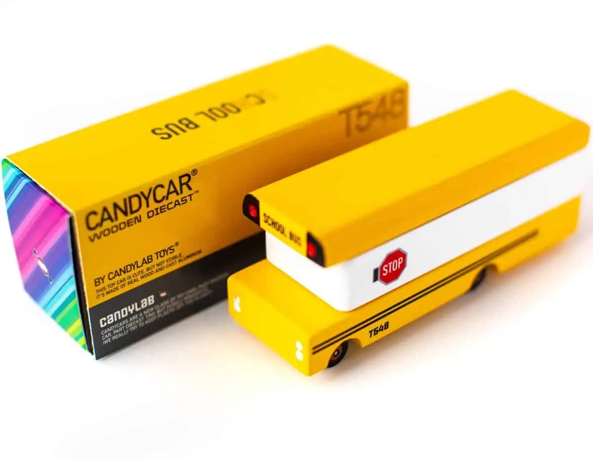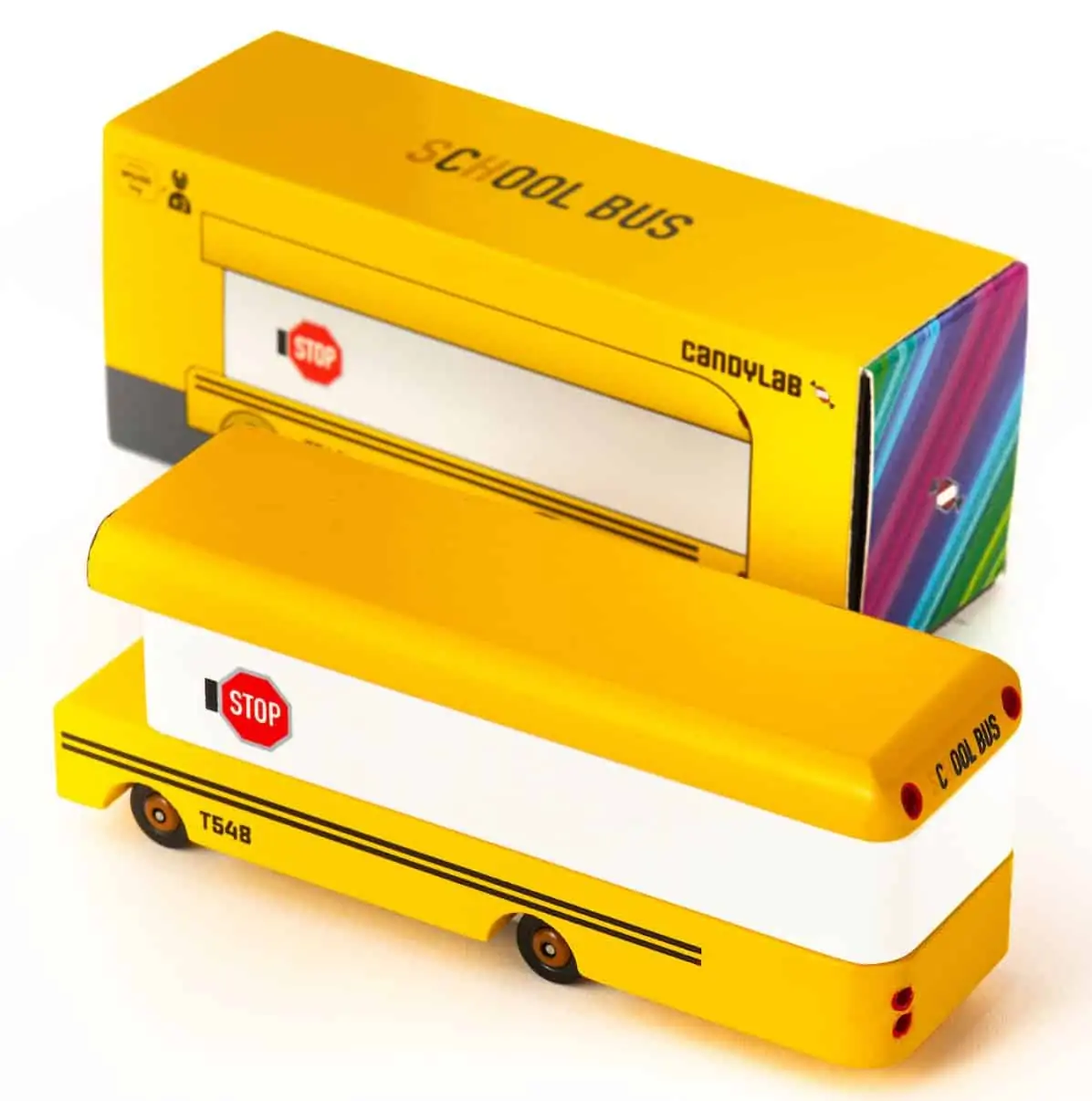 Holzauto im Stile eines amerikanischen Schulbus mit abgekratztem Schriftzug. Inklusive Reifen aus echtem Gummi, ABS Plastikfelgen und Metallachsen, die schnelles und geschmeidiges Rollen erlauben. Das alles mit der hohen Qualität und der kunstvollen Verarbeitung, die man von Candylab gewohnt ist.