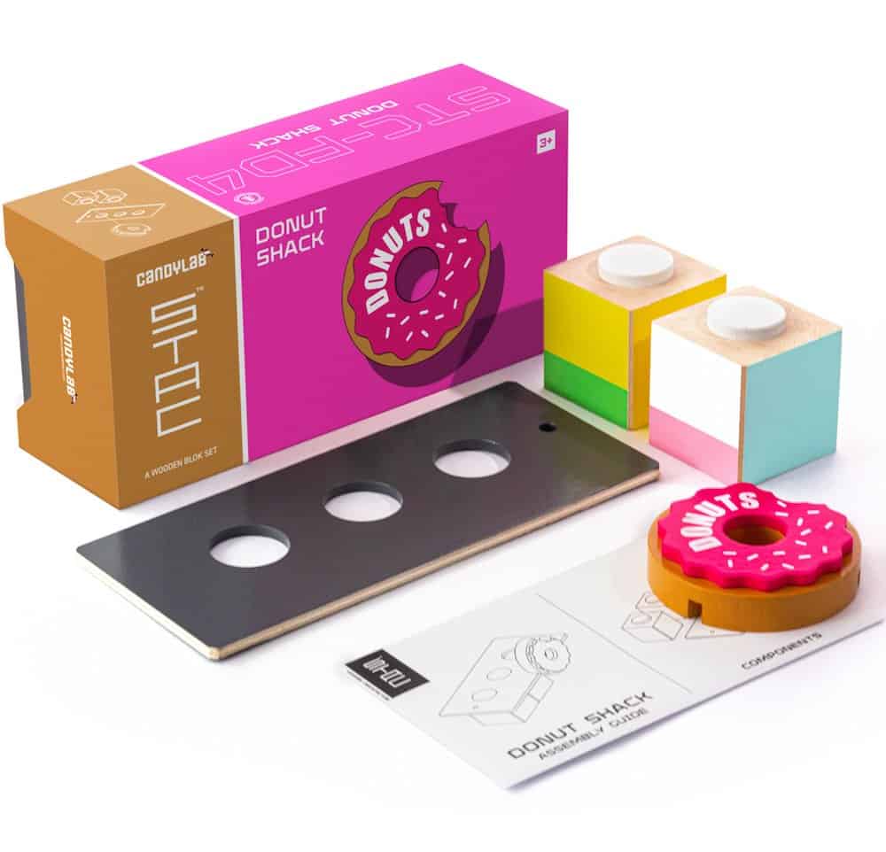 Baue mit dem modularen Set ein Drive-In-Donut-Restaurant für deine Candylab Holzautos.