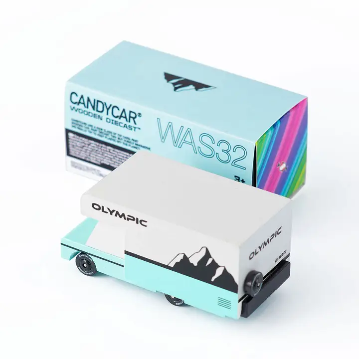 Candylab Olympic RV ist ein kompaktes Holz-Wohnmobil im Retro-Stil, inspiriert von den Bergen des Pacific Northwest. Mit seiner markanten türkis-weißen Lackierung und der klaren Formsprache lädt der Camper zu endlosen Roadtrip-Geschichten ein – auf dem Teppich, der waytoplay Strecke oder im Regal.