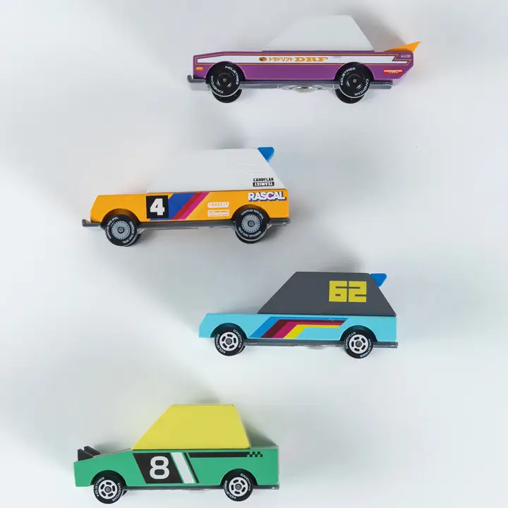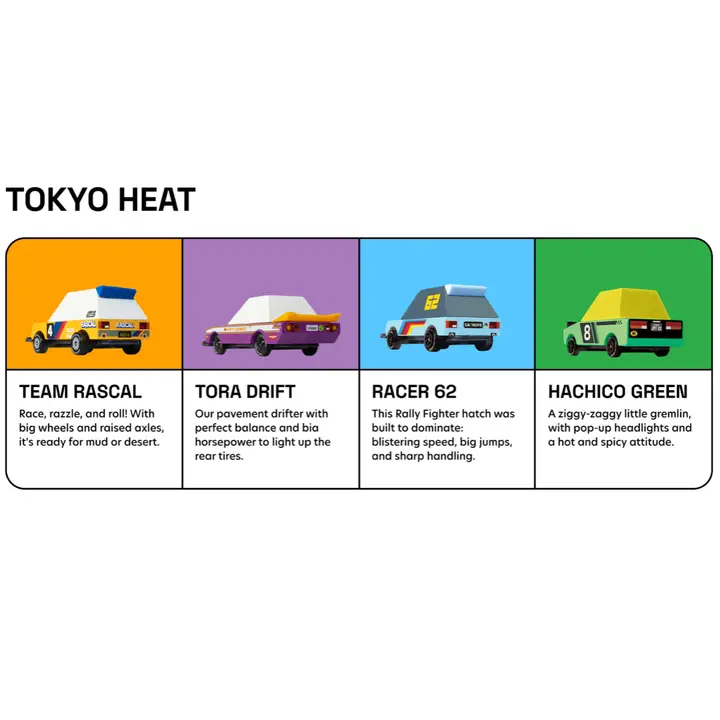 Das Candylab Tokyo Heat TOONS 4-Pack bringt gleich vier auffällige Holzrennwagen im knalligen Neon-Streetstyle ins Kinderzimmer. Die CANDYCAR® TOONS™ sind extra robust, farbintensiv und trotzdem aus Holz mit Diecast-Elementen gefertigt – perfekt für kleine Racing-Fans ab 3 Jahren.