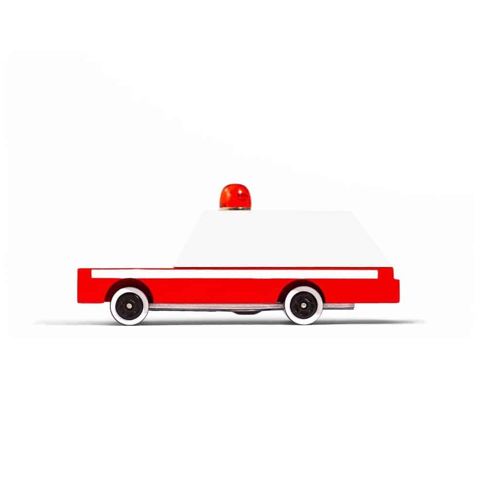 Holzauto im Stile eines amerikanischen Rettungsautos mit rot-weißer Lackierung und Sirene. Inklusive Reifen aus echtem Gummi, ABS Plastikfelgen und Metallachsen, die schnelles und geschmeidiges Rollen erlauben. Das alles mit der hohen Qualität und der kunstvollen Verarbeitung, die man von Candylab gewohnt ist.