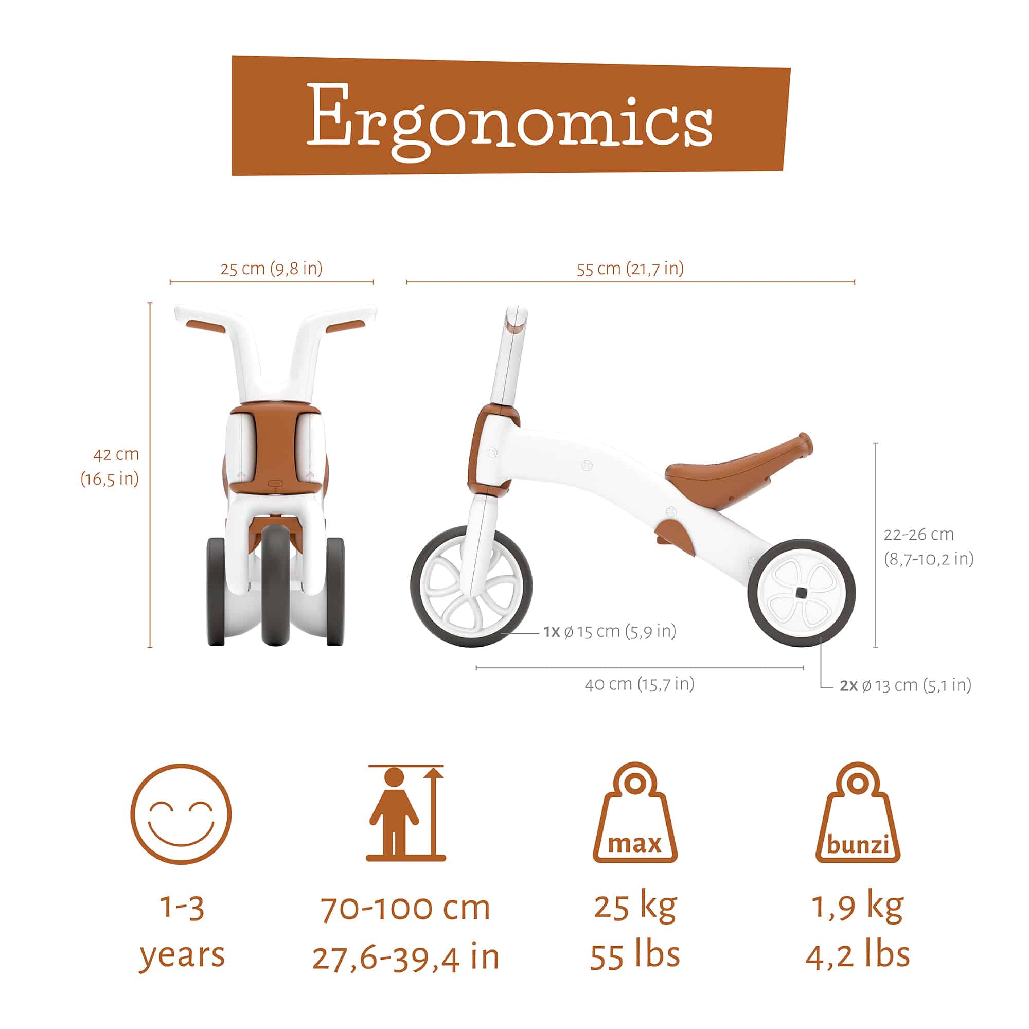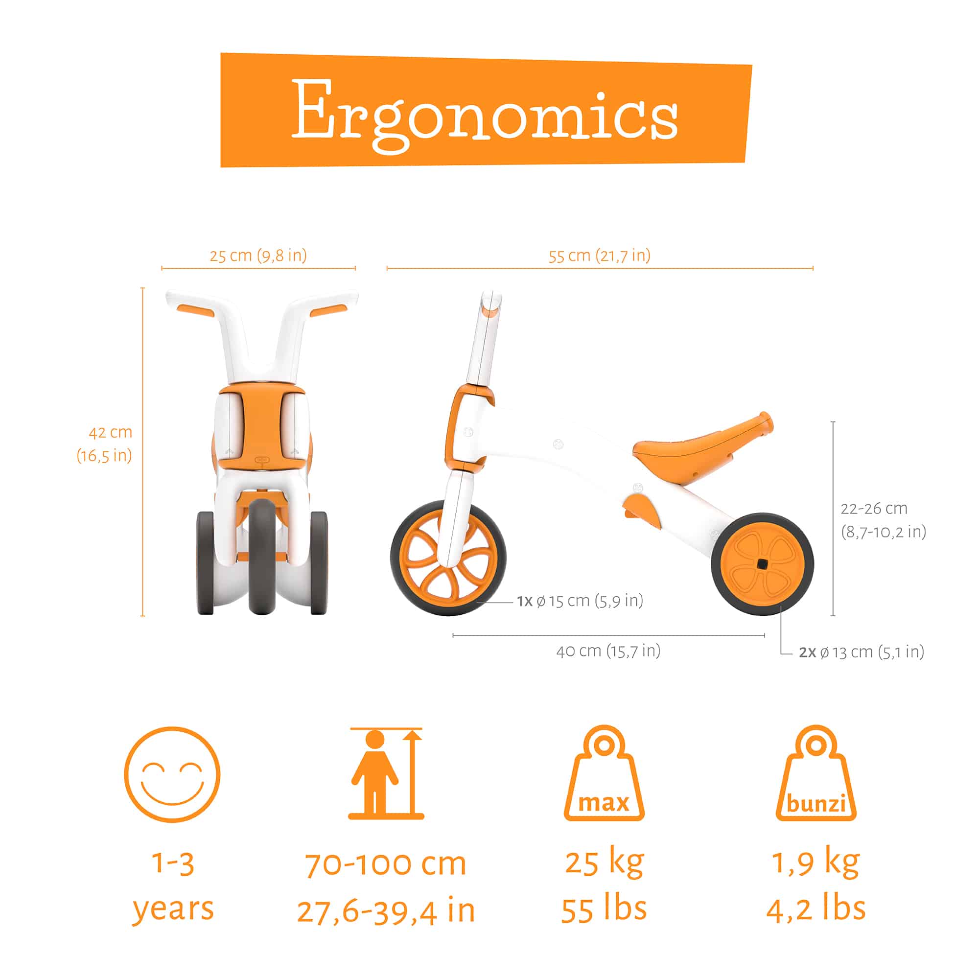 Das Chillafish Bunzi ist von Boden bis Lenker etwa 42 cm hoch und 55 cm lang. Die Sitzhöhe ist von 22 cm bis 26 cm ohne Werkzeug einstellbar. Das Laufrad eignet sich für Kinder von etwa 1-3 Jahren mit einer Größe von 70 cm bis max. 1 m und einem Maximalgewicht von 25 kg. Das Bunzi selbst ist mit 1,9 Kilo ein Leichtgewicht.