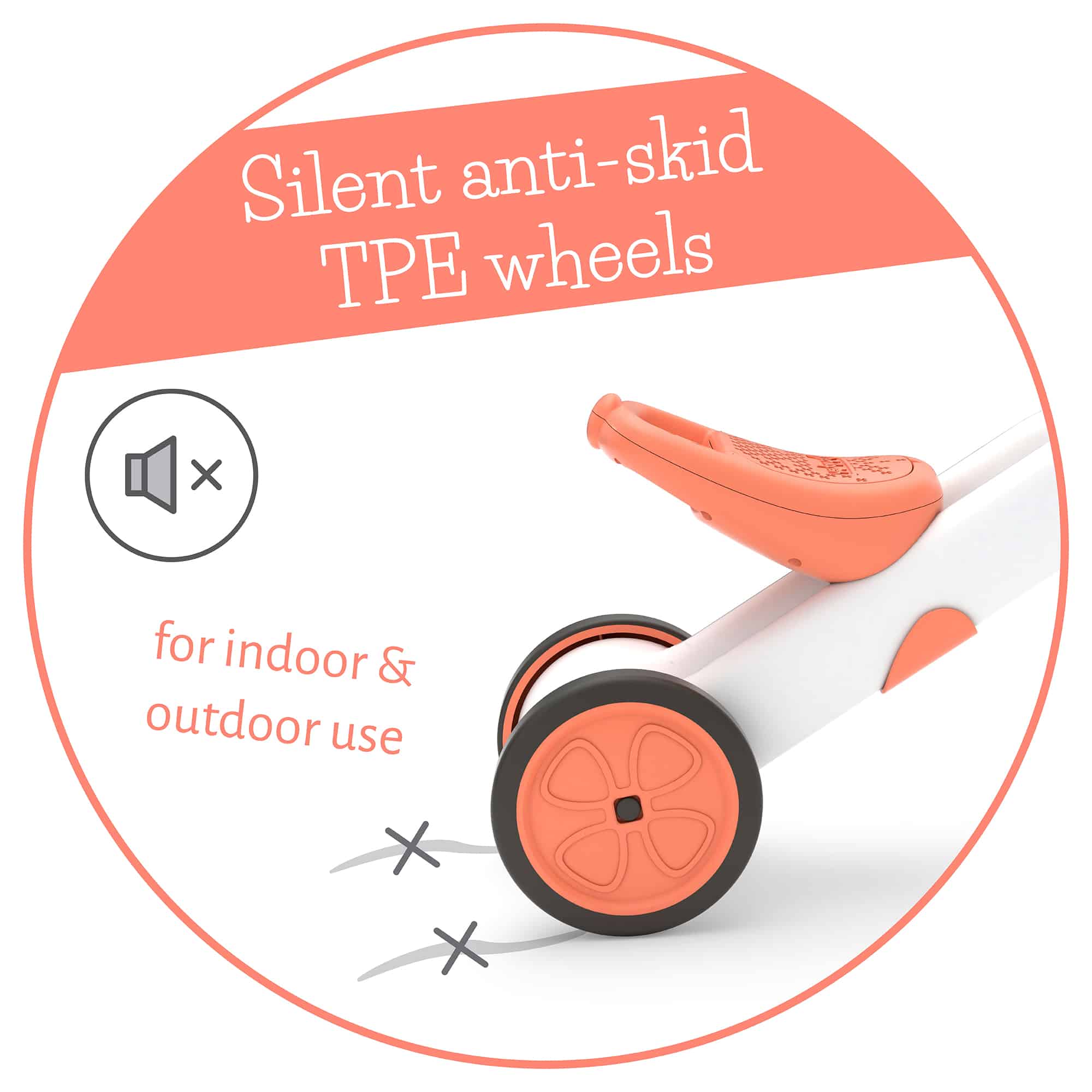 Dank der TPE-Reifen kannst du dein Fahrzeug sowohl drinnen als auch draußen benutzen. Außerdem sind die Reifen sehr leise. Sie rutschen nicht und sie quietschen nicht. Bunzi ist in vier verschiedenen Ausführungen erhältlich.