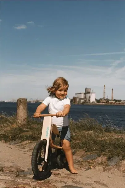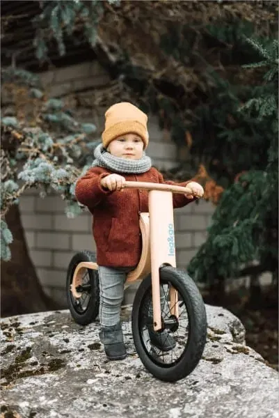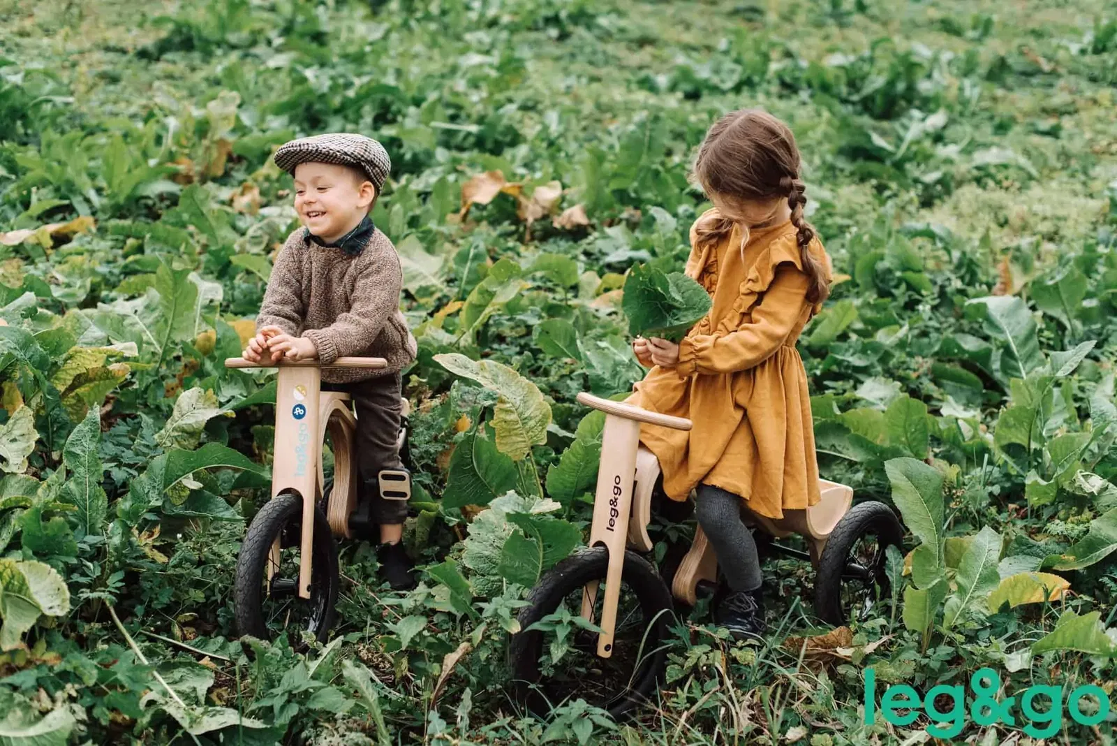 Das Leg&Go Bike besteht aus Birkenholz, hat allerdings wie ein echtes Fahrrad Luftbereifung, Leichtmetall-Felgen und Edelstahl-Speichen. Die Teile sind äußerst stabil und halten mehrere Jahre. Die Holz-Rohstoffe werden ausschließlich aus nachhaltigen Quellen in Nordeuropa bezogen.